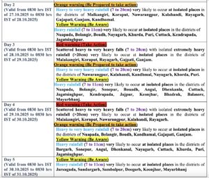 A red alert (rainfall of 20 cm and above) has been issued for seven districts—Koraput, Malkangiri, Rayagada, Nabarangpur, Kalahandi, Ganjam, and Gajapati – on October 28-29. An orange warning of heavy to very heavy rainfall of 12 cm to 20 cm has been issued for the districts of Puri, Khurda, Nayagarh, Kandhamal, Kalahandi, Nuapada, Balangir, Boudh, Kandhamal, Gajapati, Ganjam and Nabarangpur on these two days.