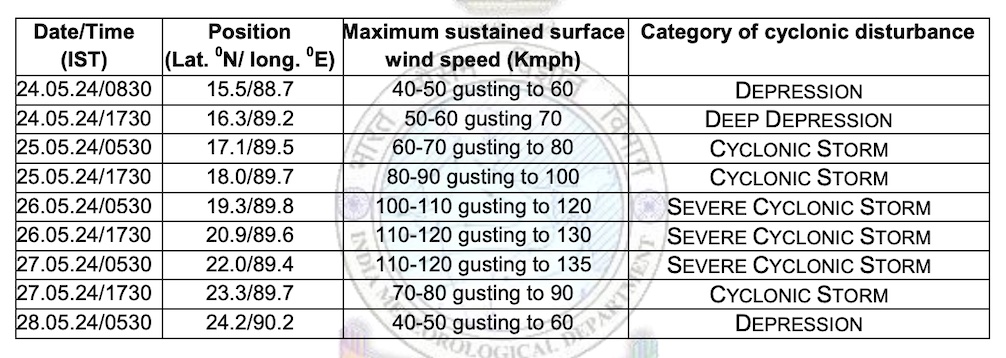 “The Depression over Central Bay of Bengal has moved northeastwards with a speed of 20 kmph during past 3 hours, and lay centered over the same region about 730 km south-southwest of Khepupara (Bangladesh) and 750 km south of Canning (West Bengal). It is very likely to continue to move northeastwards and intensify further into a cyclonic storm over Eastcentral Bay of Bengal by May 25 morning. Subsequently, it would move nearly northwards, intensify into a severe cyclonic storm by May 25 night. Continuing to move nearly northwards, it is very likely to cross Bangladesh and adjoining West Bengal coasts between Sagar Island and Khepupara around May 26 midnight as a severe cyclonic storm.”