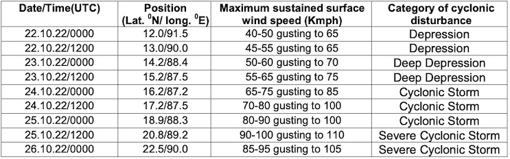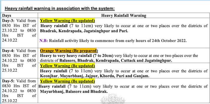 Under the influence of the system, squally wind with speed reaching 35-45 kmph gusting to 55 kmph is likely on October 23, 45-55 kmph gusting to 65 kmph on October 24 and 50-60 kmph gusting to 70 kmph on October 25 along and off Odisha coast. Fishermen have been advised not to venture into deep sea area of central Bay of Bengal from October 22 and along and off Odisha coast and westcentral and North Bay of Bengal from October 23 to 26.