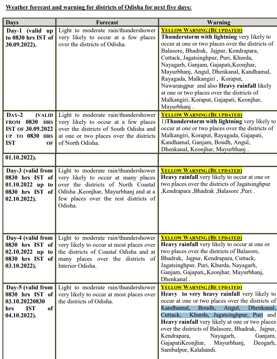 Bhubaneswar: The India Meteorological Department (IMD) on Thursday issued a yellow warning for heavy rainfall for one or two places in Malkangiri, Koraput, Gajapati, Keonjhar, and Mayurbhanj districts till 8.30 am on September 30.