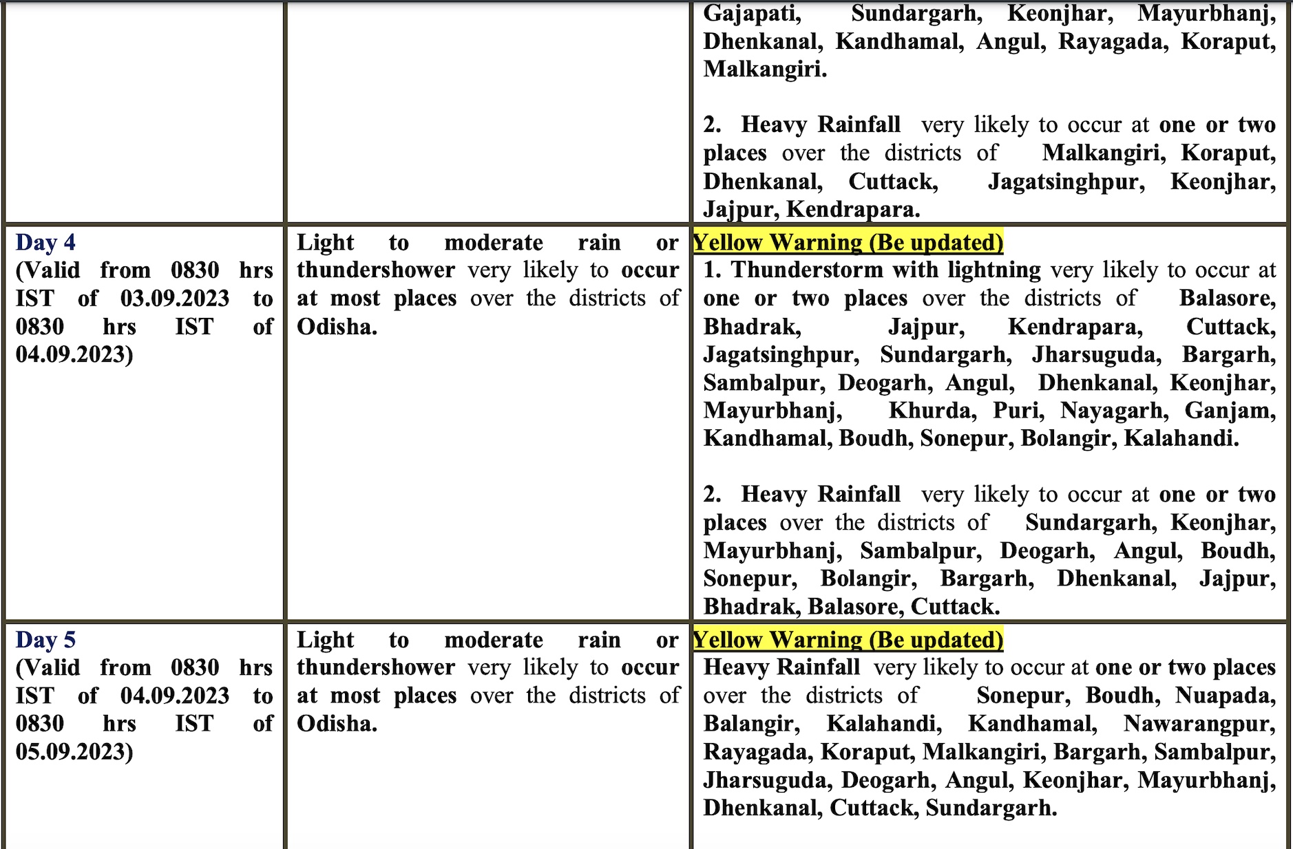 On September 4, heavy rainfall may occur at one or two places in Sonepur, Boudh, Nuapada, Balangir, Kalahandi, Kandhamal, Nabarangpur, Rayagada, Koraput, Malkangiri, Bargarh, Sambalpur, Jharsuguda, Deogarh, Angul, Keonjhar, Mayurbhanj, Dhenkanal, Cuttack and Sundargarh. There will be little change in the weather conditions thereafter.
