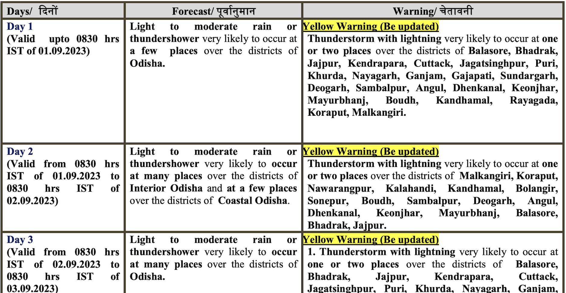 On September 4, heavy rainfall may occur at one or two places in Sonepur, Boudh, Nuapada, Balangir, Kalahandi, Kandhamal, Nabarangpur, Rayagada, Koraput, Malkangiri, Bargarh, Sambalpur, Jharsuguda, Deogarh, Angul, Keonjhar, Mayurbhanj, Dhenkanal, Cuttack and Sundargarh. There will be little change in the weather conditions thereafter.