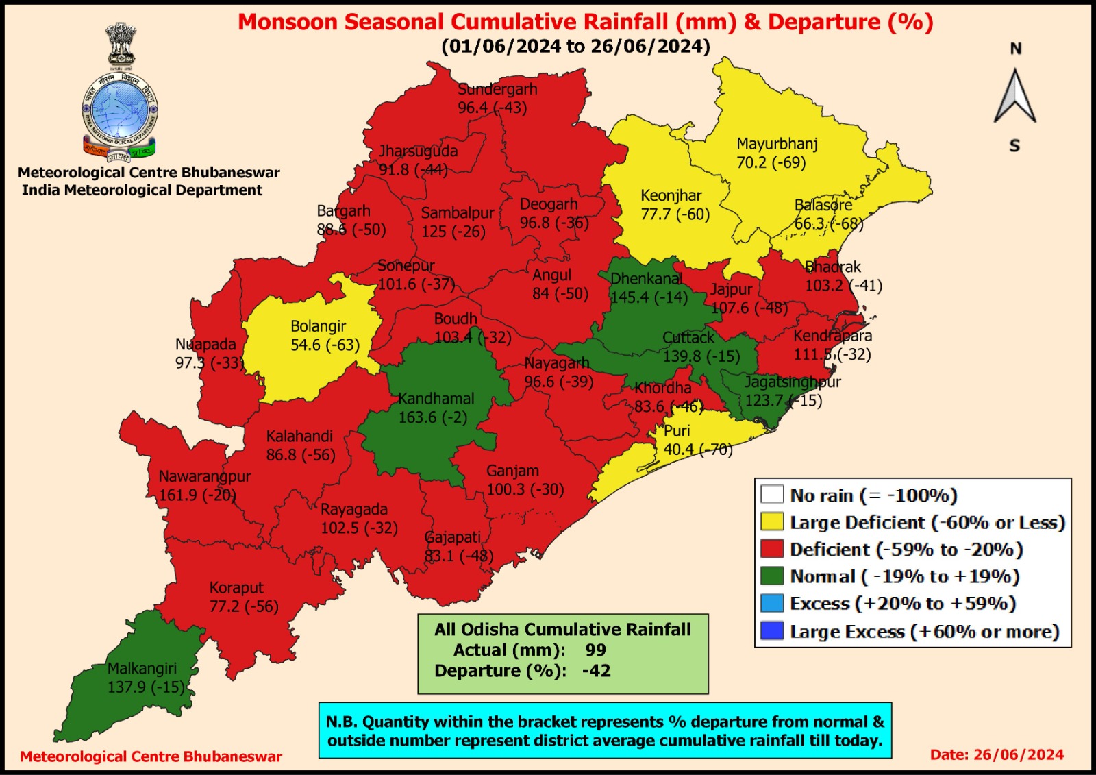 According to the weather agency, heavy rain may lash one or two places in Malkangiri, Koraput, Rayagada, Gajapati, Ganjam, Kalahandi, Kandhamal, Nuapada, and Bargarh on June 26. Thunderstorm with lightning accompanied by gusty surface windspeed reaching 30-40 kmph is also likely in Balasore, Bhadrak, Jajpur, Kendrapada, Cuttack, Jagatsinghpur, Sundargarh, Jharsuguda, Bargarh, Sambalpur, Deogarh, Angul, Dhenkanal, Keonjhar, Mayurbhanj, Puri, Khurda, Nayagarh, Ganjam, Gajapati, and Kalahandi districts.