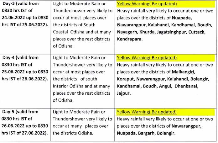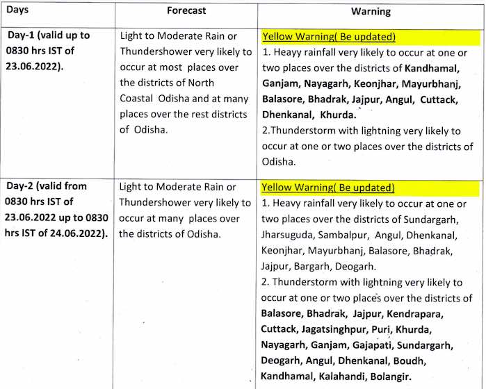 According to the MeT office, heavy rain is likely to lash one or two places in Kandhamal, Ganjam, Nayagarh, Keonjhar, Mayurbhanj, Balasore, Bhadrak, Jajpur, Angul, Cuttack, Dhenkanal and Khurda till 8.30 am on Thursday (June 23).