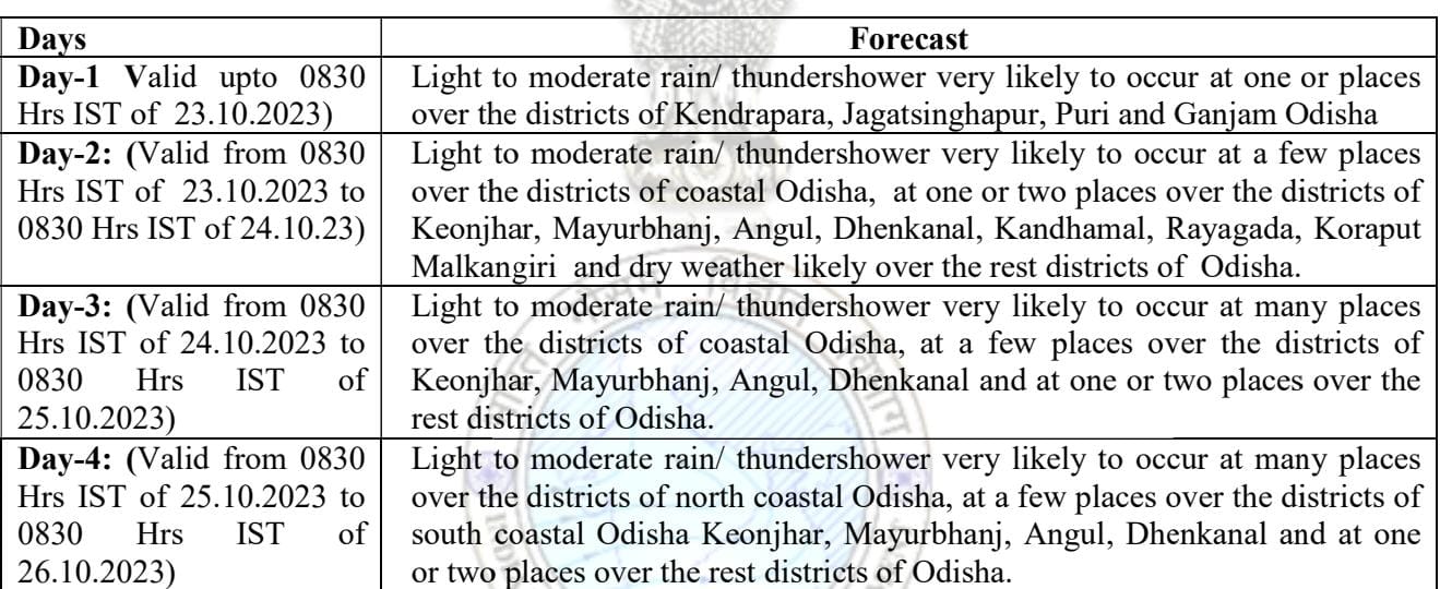 Squally wind speed reaching 40-50 kmph gusting to 60 kmph is likely on October 23 and gradually increase becoming gale wind speed reaching 60-70 kmph gusting to 80 kmph from October 24-26 along and off Odisha coast. Fishermen have been advised not to venture into westcentral Bay of Bengal till October 25, adjoining eastcentral & southeast Bay of Bengal till October 23 and North Bay of Bengal and along & off Odisha, West Bengal and Bangladesh coasts from October 24-26.