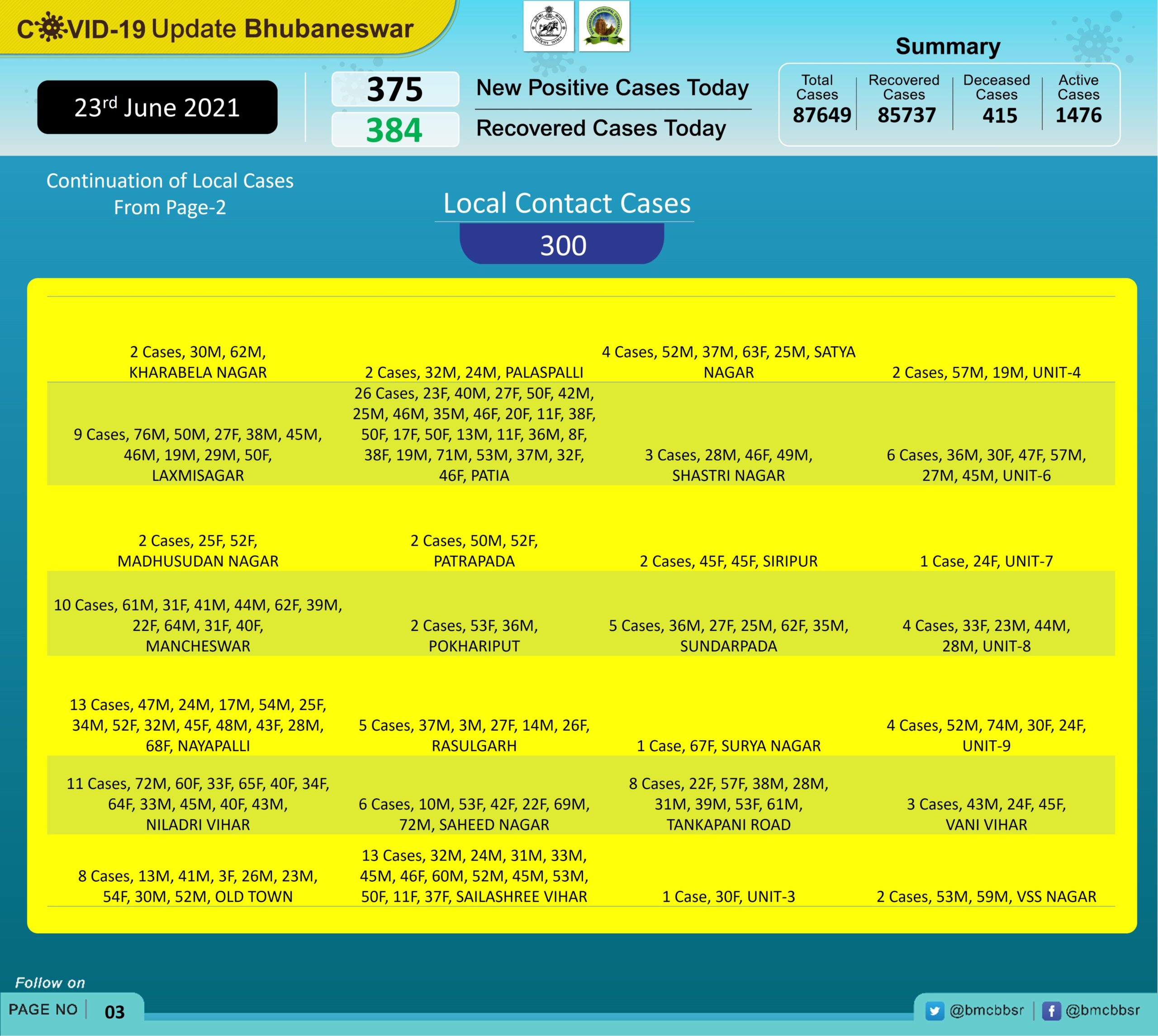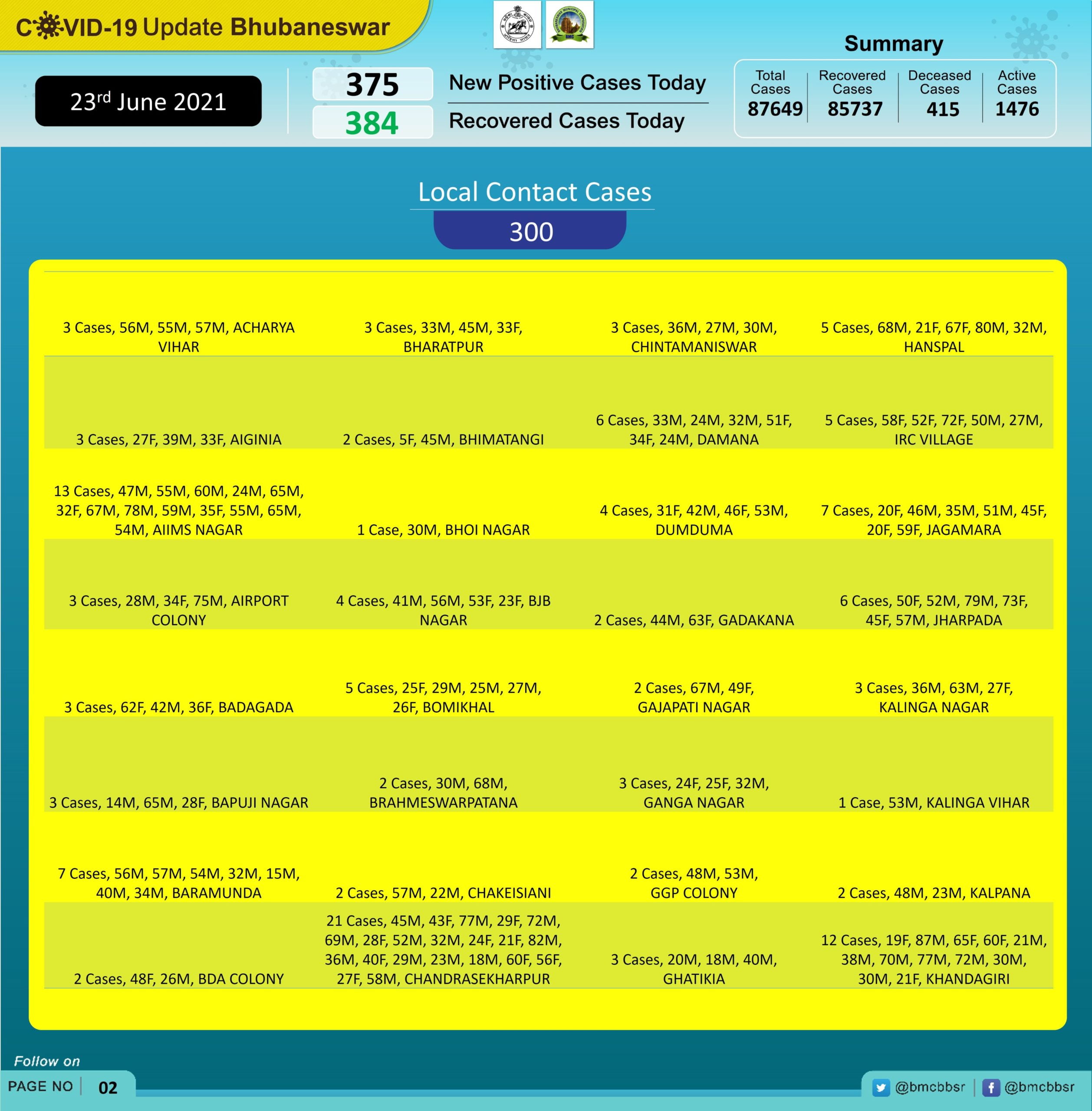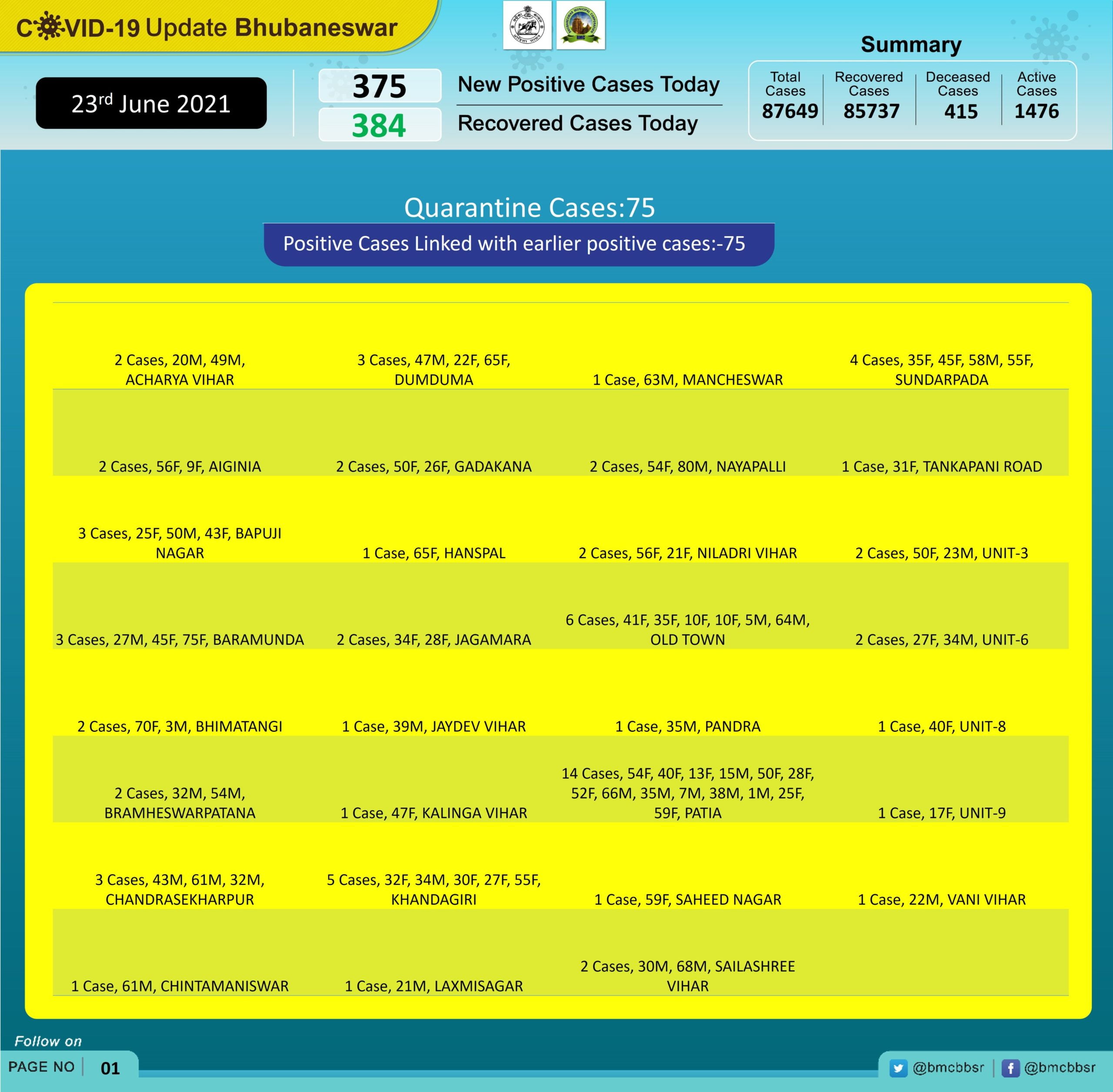 Of the latest cases, 75 were from quarantine and 300 local contacts, tweeted Bhubaneswar Municipal Corporation.
