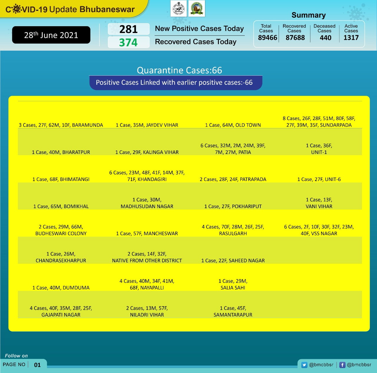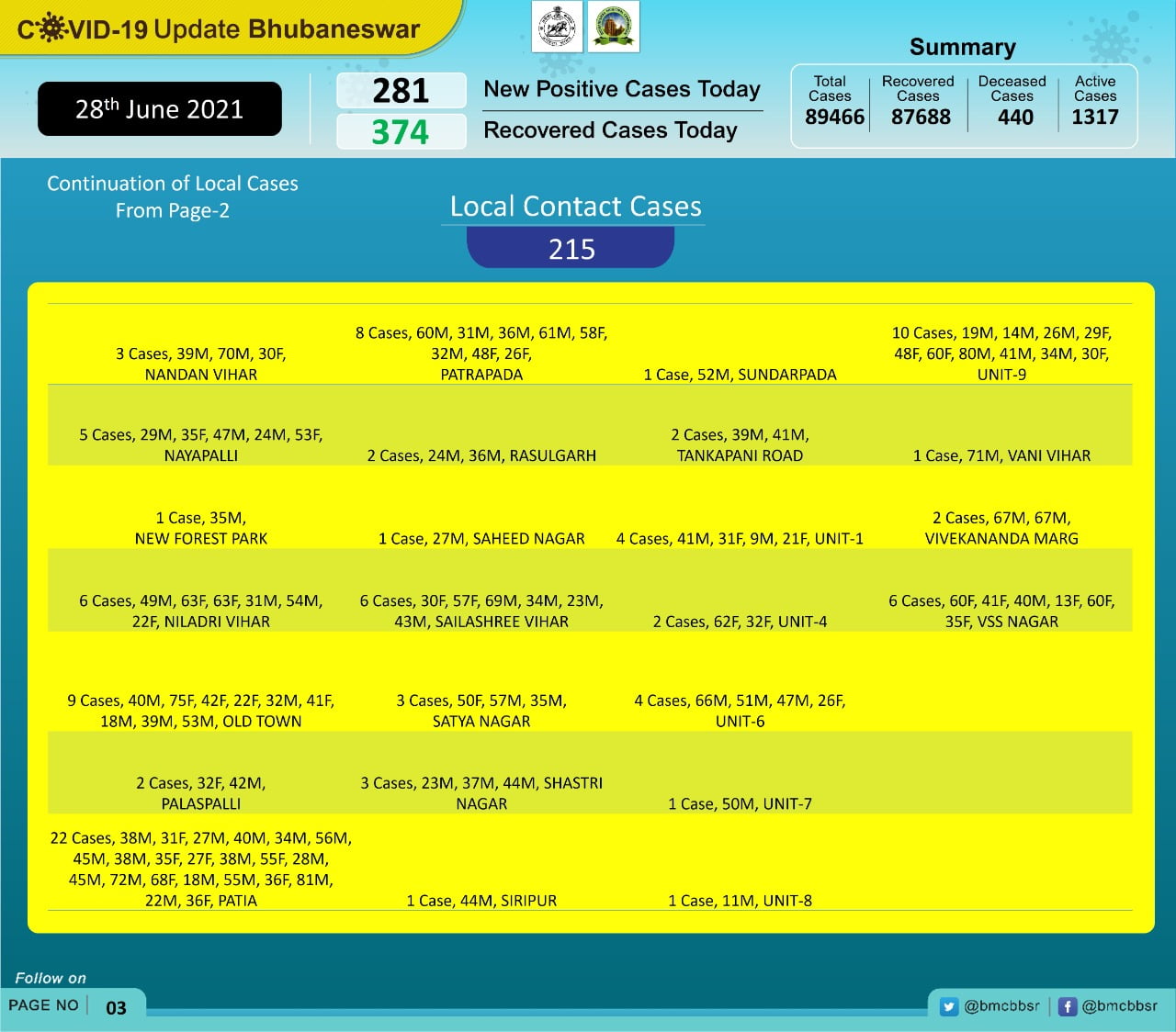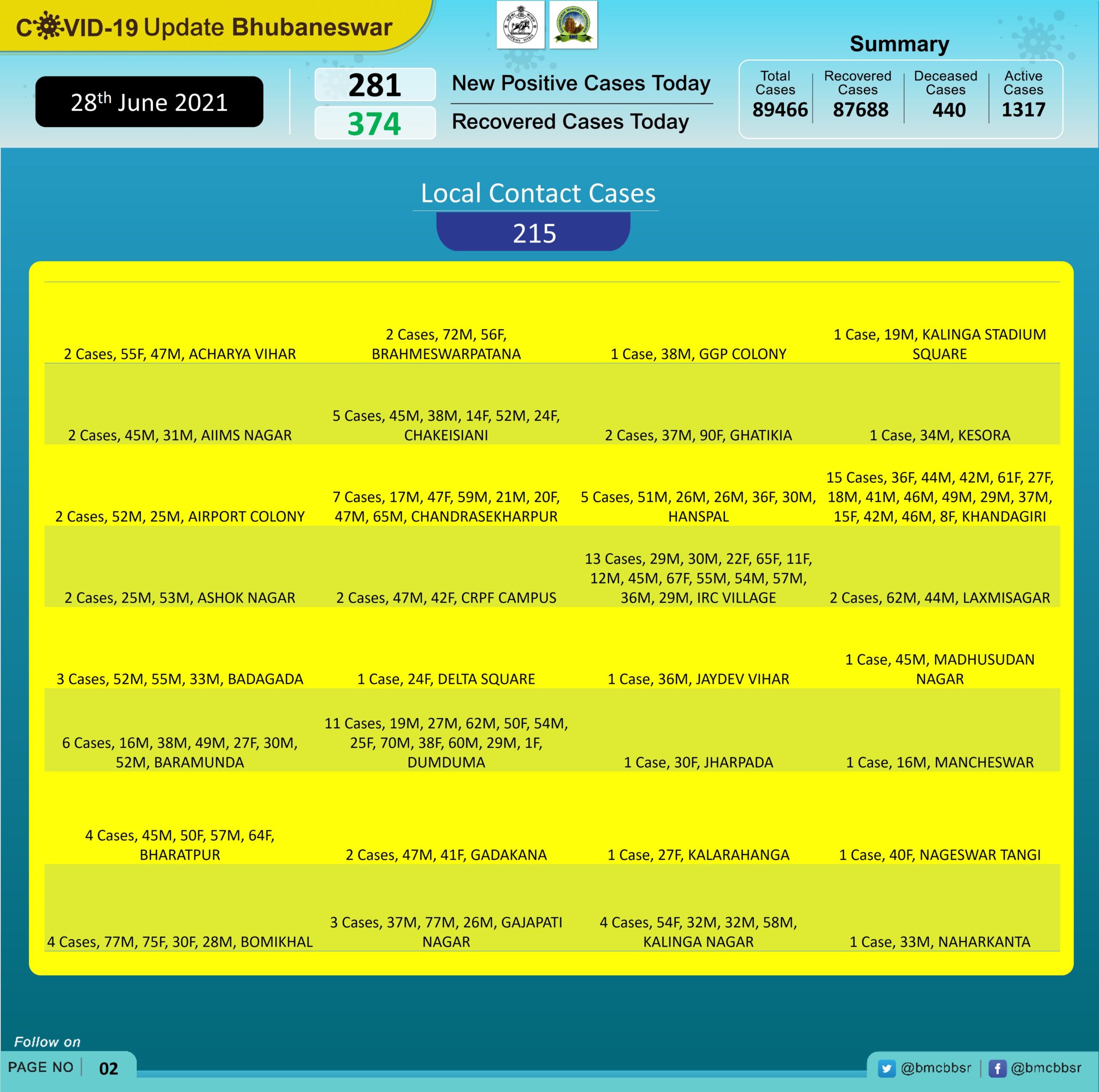 Of the new cases, 66 are from quarantine and 215 local contacts, Bhubaneswar Municipal Corporation stated in its tweet.