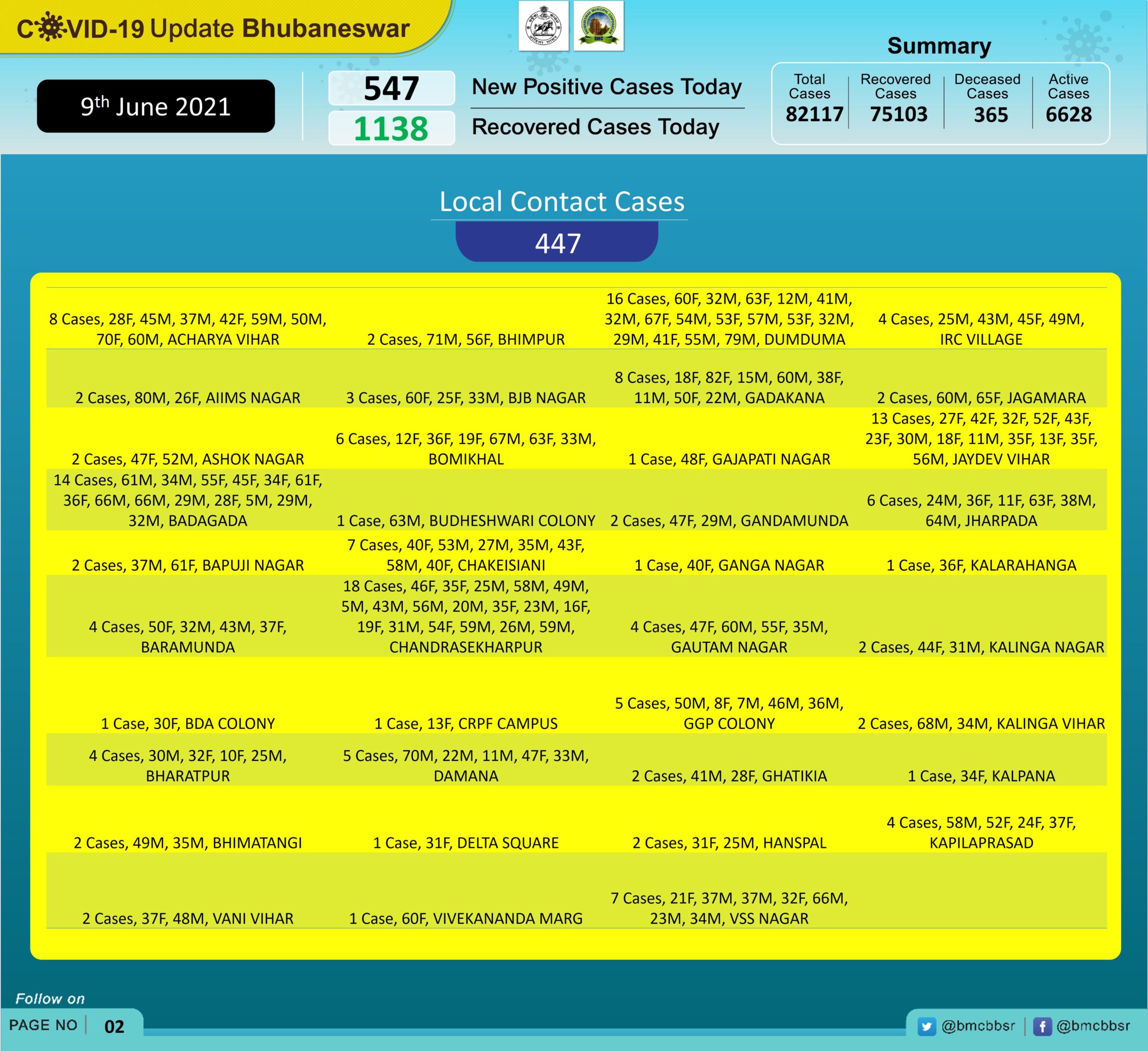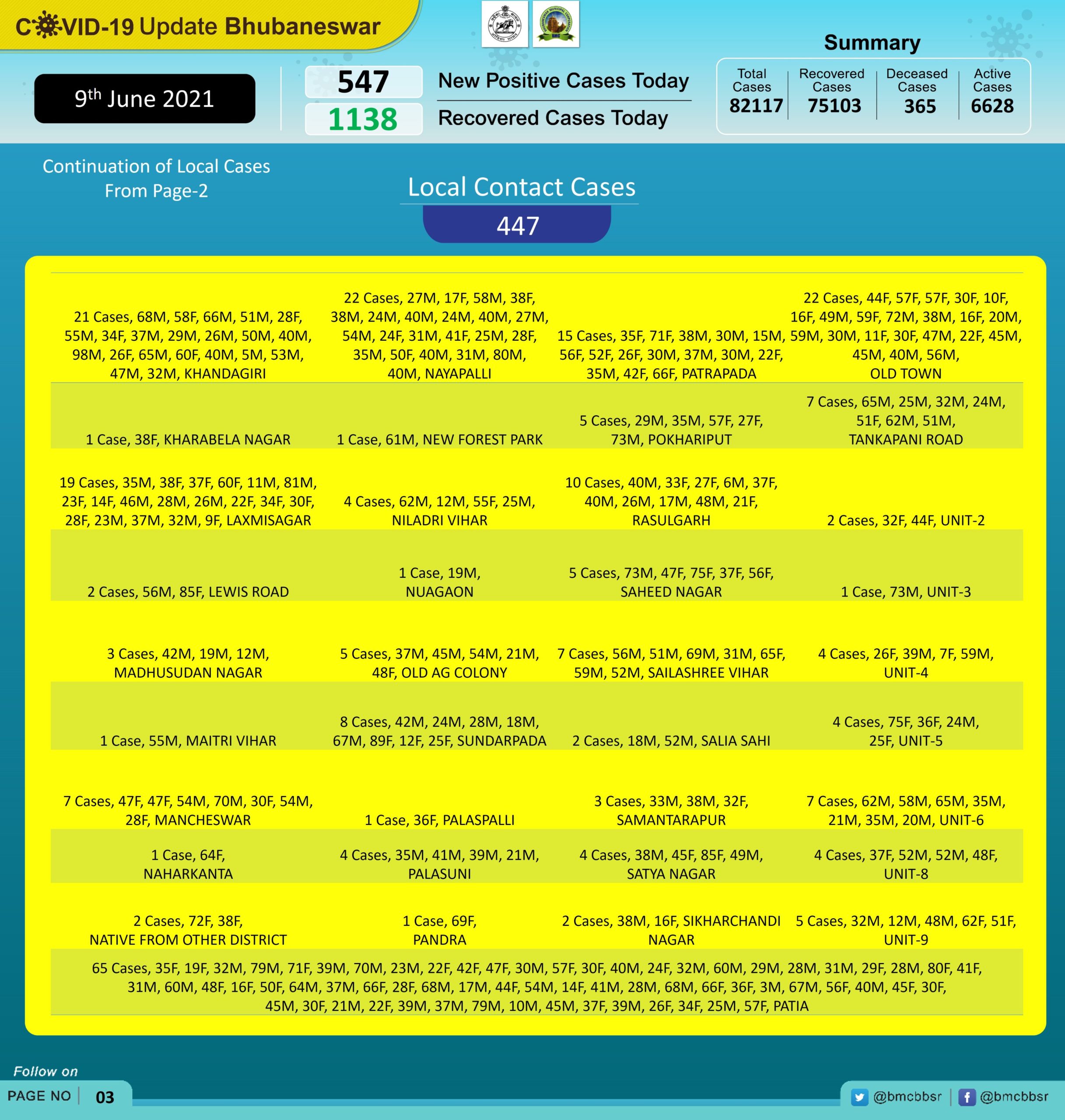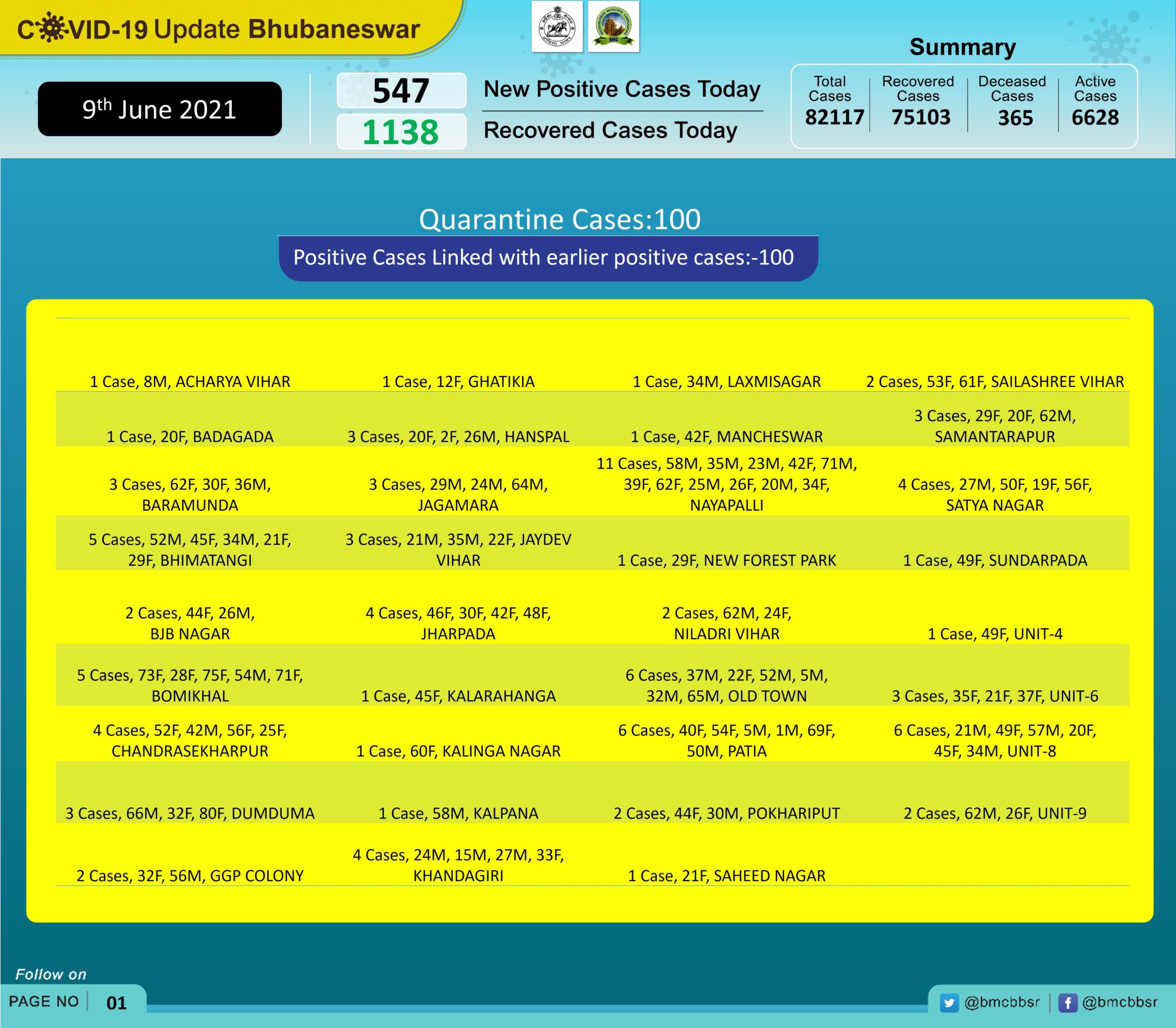 Among the new cases, 100 are from quarantine and 447 through local contacts. The total number of cases in Bhubaneswar has now gone up to 82,117.
