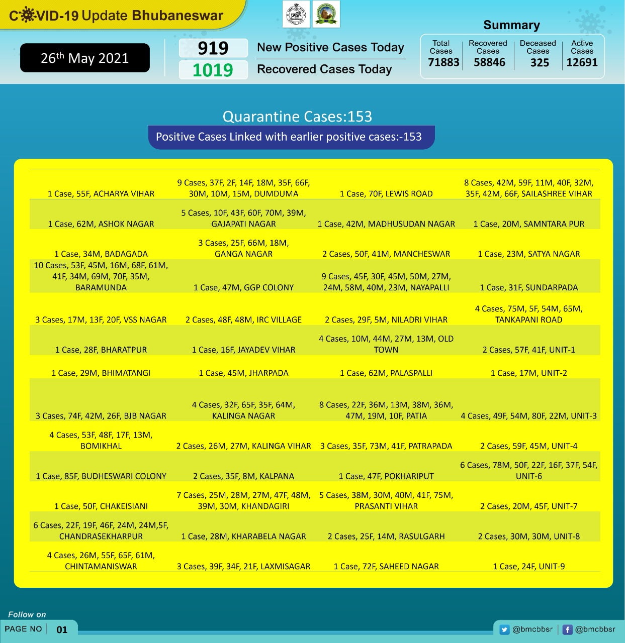 Bhubaneswar had seen 905 fresh COVID cases on May 24, while on Tuesday the number of new infections was 1,062.