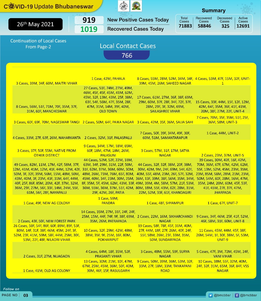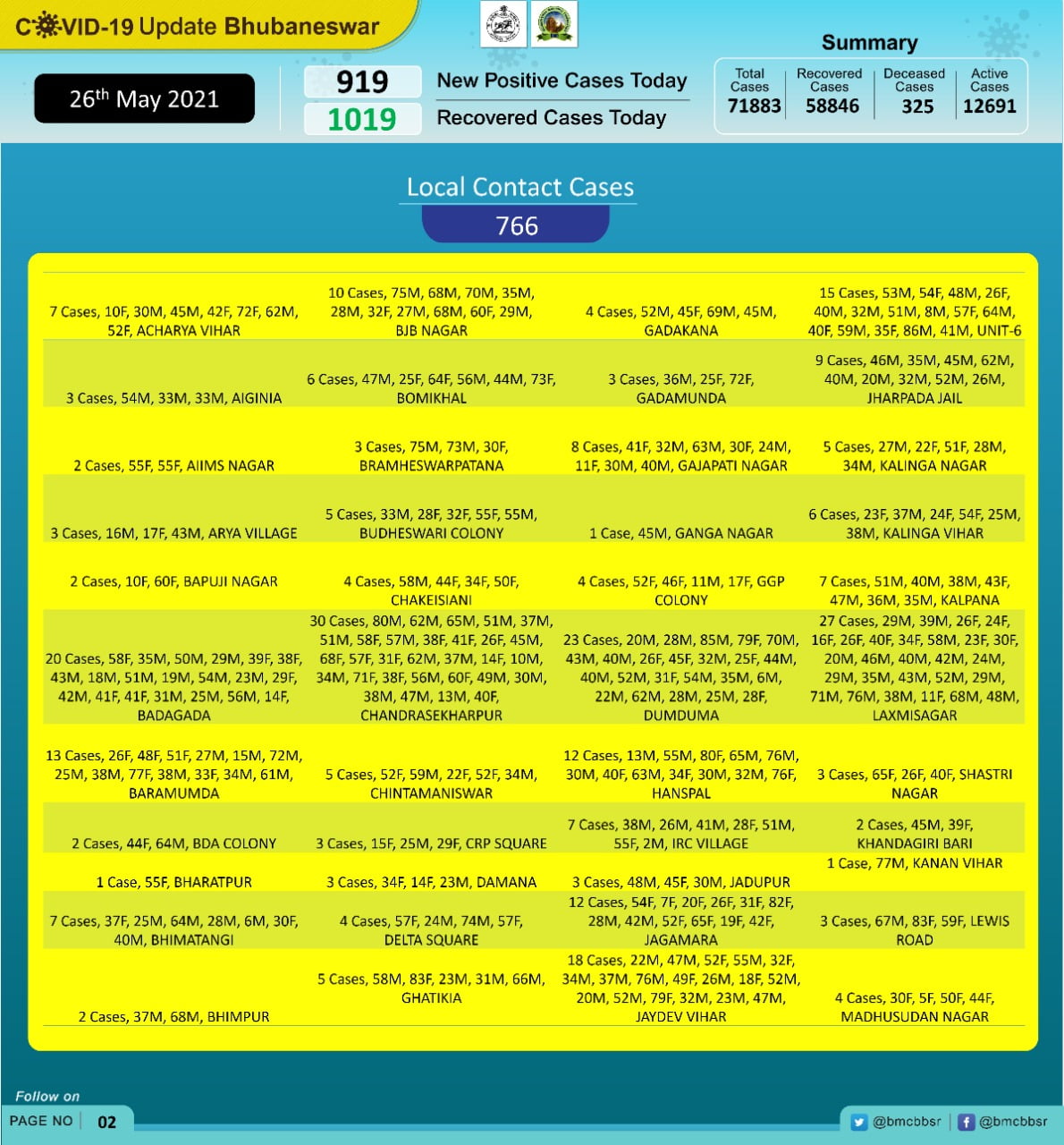 Maximum cases were reported from Nayapalli (49), followed by Patia, Khandagiri and Shyampur (44 each), Jharpada (39), Chandrasekharpur (30), Laxmisagar and Old Town (27 each), Niladri Vihar (26), Dumduma (23), Badagada (20), Sundarapada (19), Jaydev Vihar (18), Sailashree Vihar (17), Unit-6 and Unit-4 (15 each).