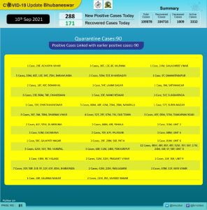 According to Bhubaneswar Municipal Corporation (BMC), of the total cases on the day, 90 were from quarantine and 198 local contacts.