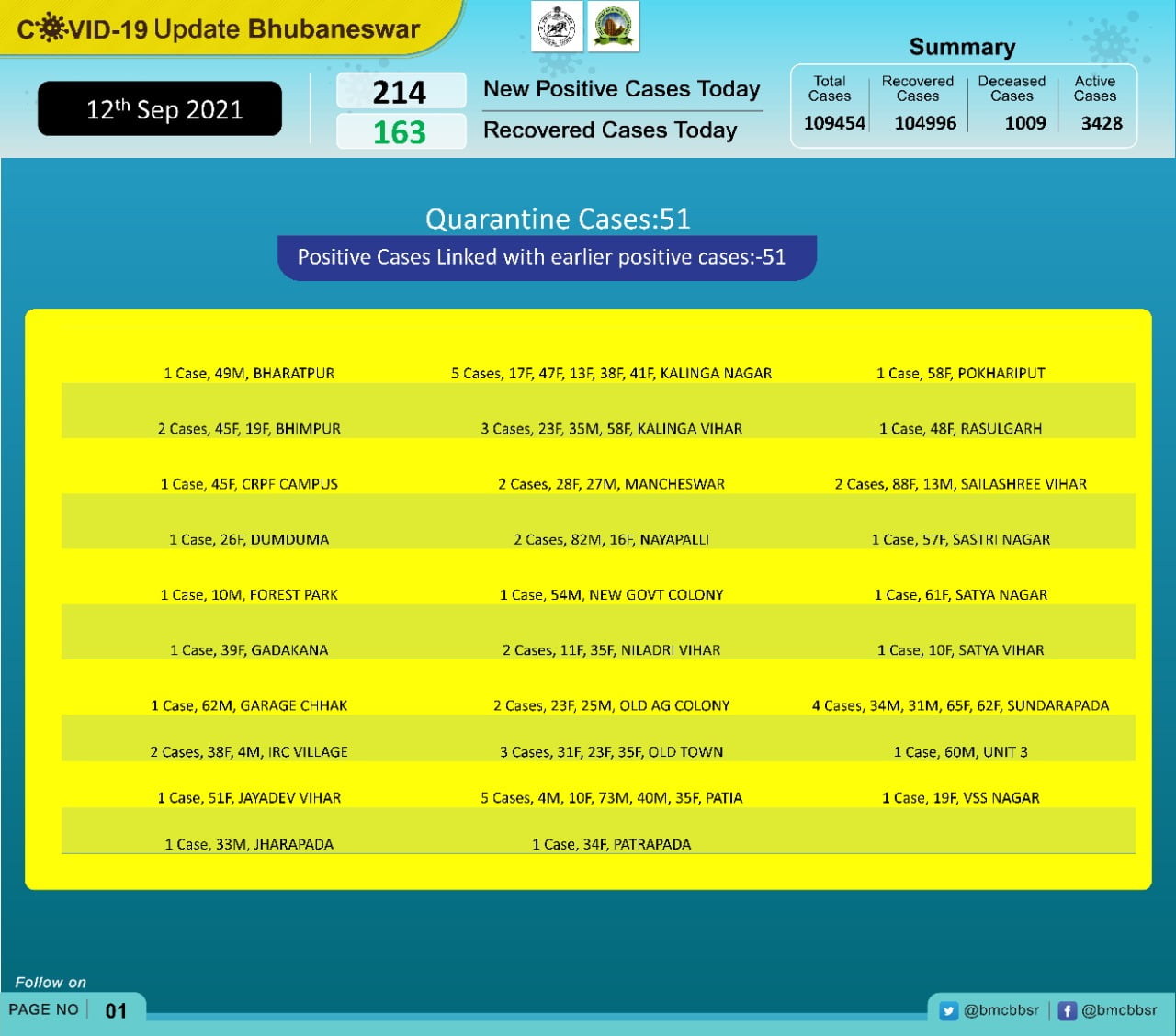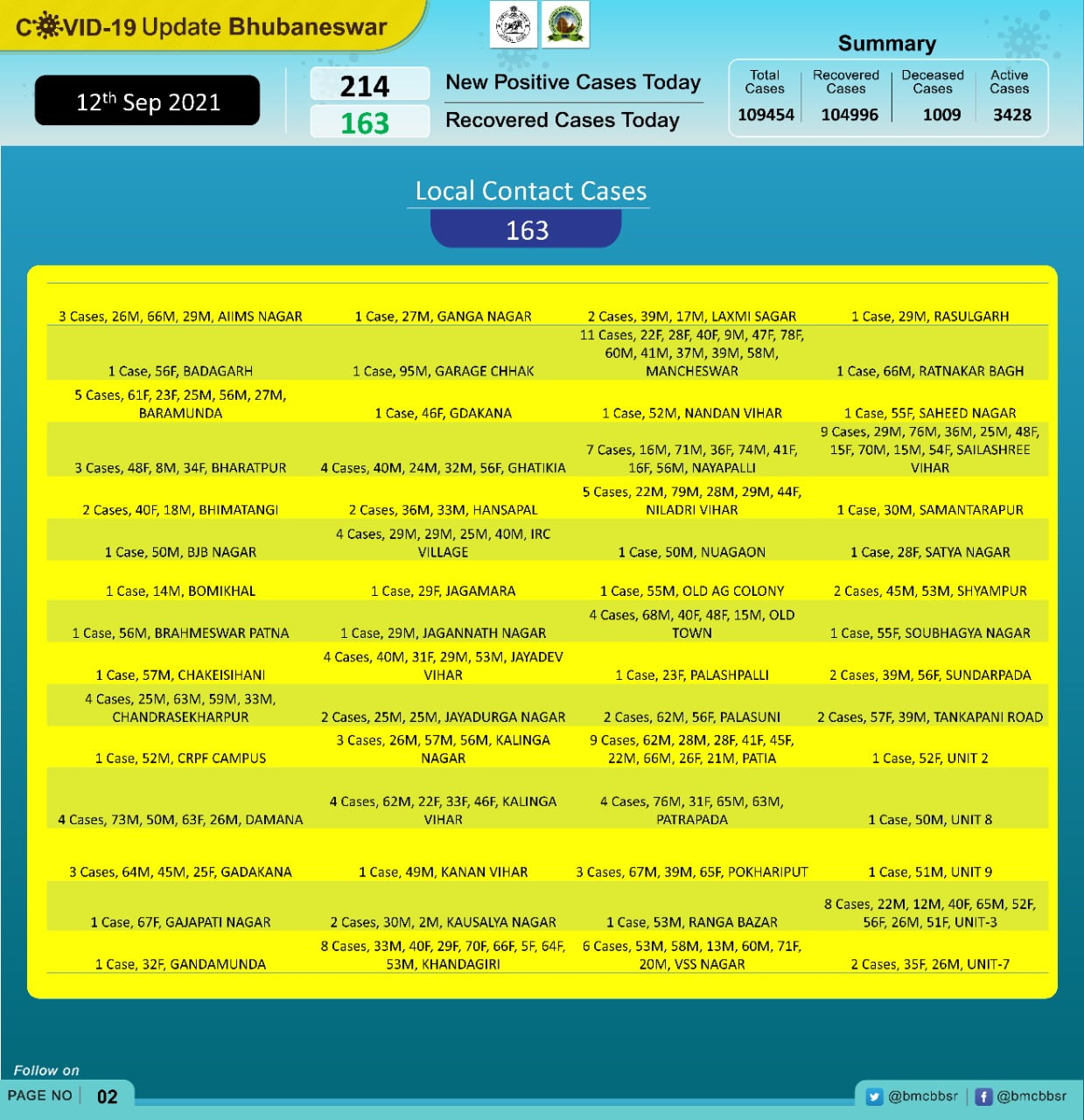 According to Bhubaneswar Municipal Corporation (BMC), of the total cases on the day, 51 were from quarantine and 163 local contacts.