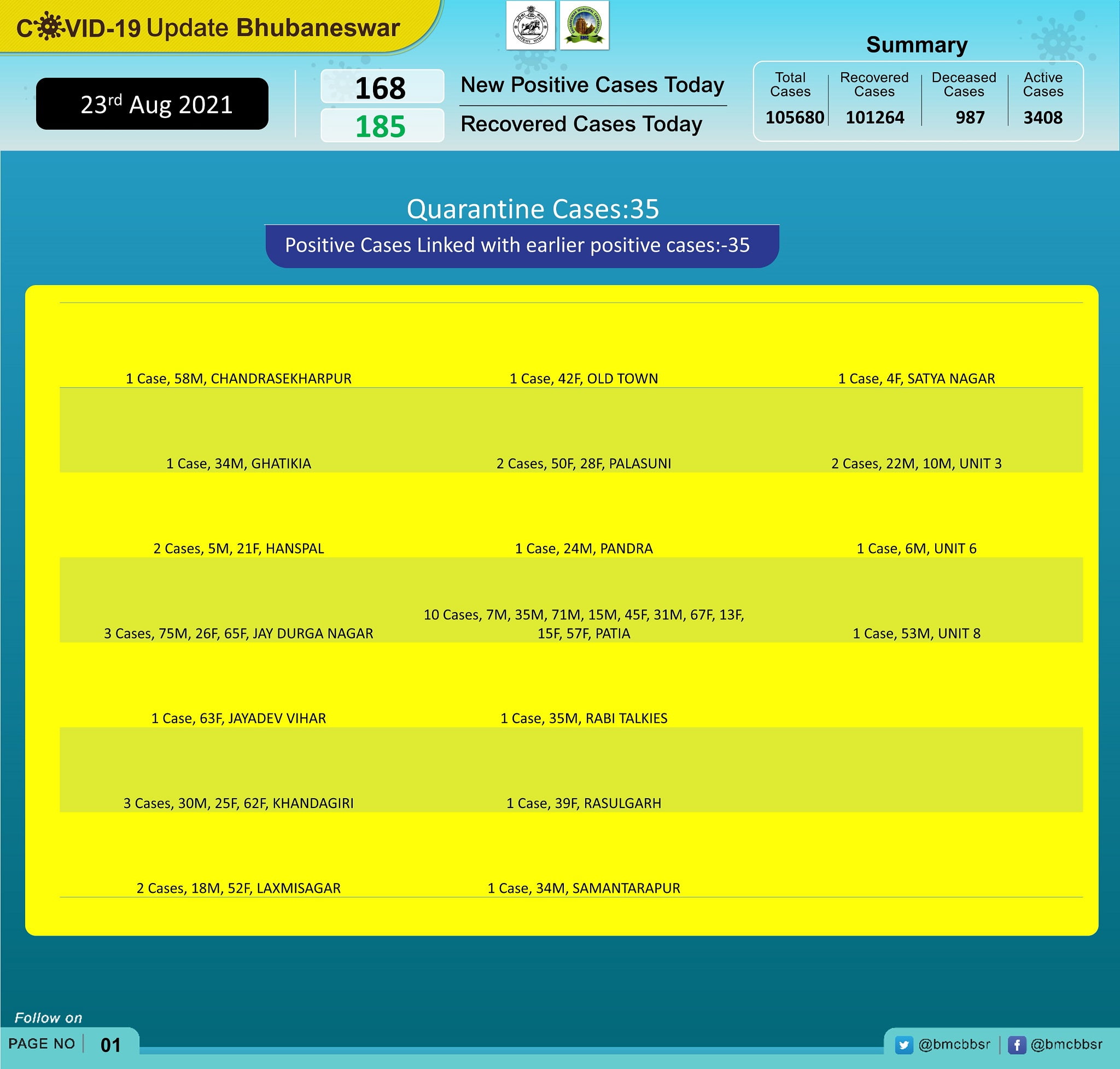 Among the new infections, 35 are from quarantine and 133 local contacts. Among the local contact cases, the highest of 8 cases each have been reported from Patia and Nayapalli, followed by 7 each from Jharpada and Old Town, and 6 each from Laxmi Sagar and Saheed Nagar, according to Bhubaneswar Municipal Corporation (BMC).