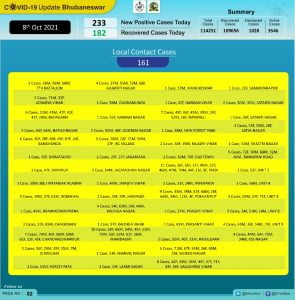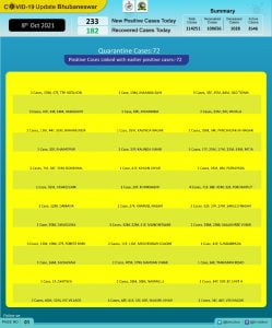 According to Bhubaneswar Municipal Corporation (BMC), 72 of the new patients on the day are from quarantine and 161 local contacts.