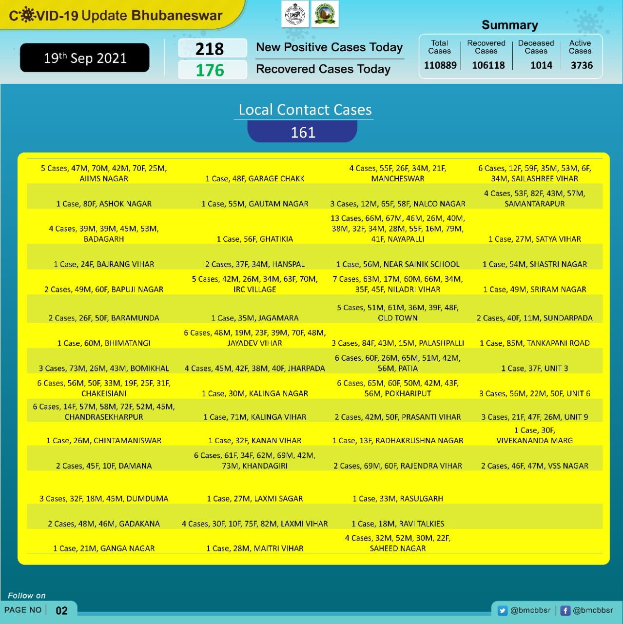According to Bhubaneswar Municipal Corporation (BMC), 57 of the new infections are from quarantine and 161 local contacts.