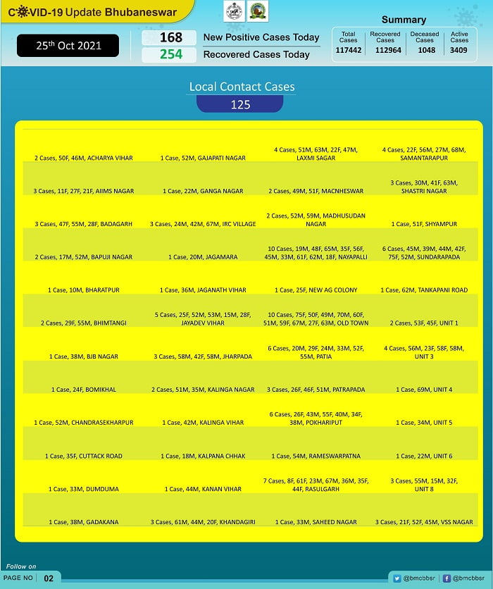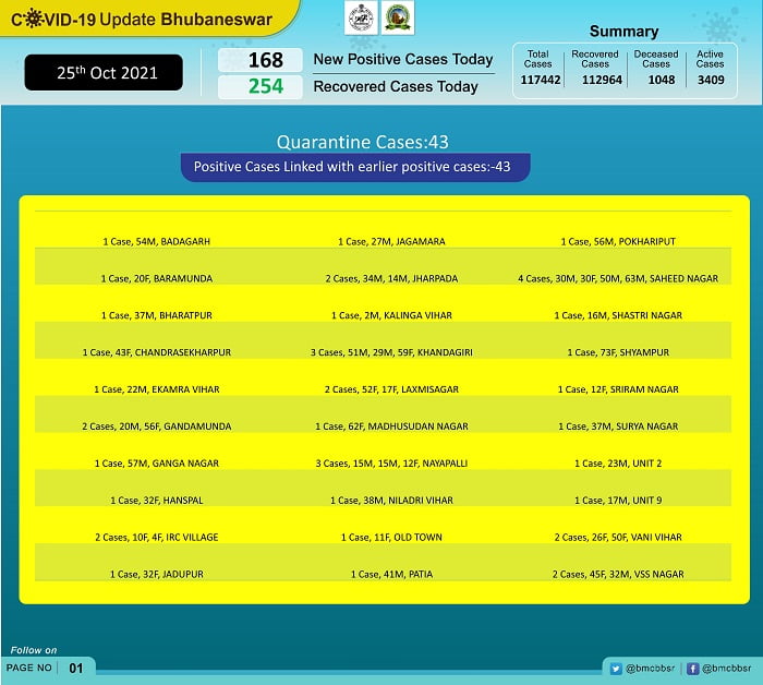 According to Bhubaneswar Municipal Corporation (BMC), 43 of the new patients on the day are from quarantine and 125 local contacts.