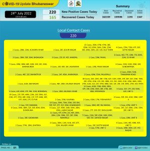 According to Bhubaneswar Municipal Corporation (BMC), as many as 220 new cases were registered in Bhubaneswar on Sunday compared to 191 on Saturday and 237 on Friday. Total 165 recovered cases were reported from the city during the period.