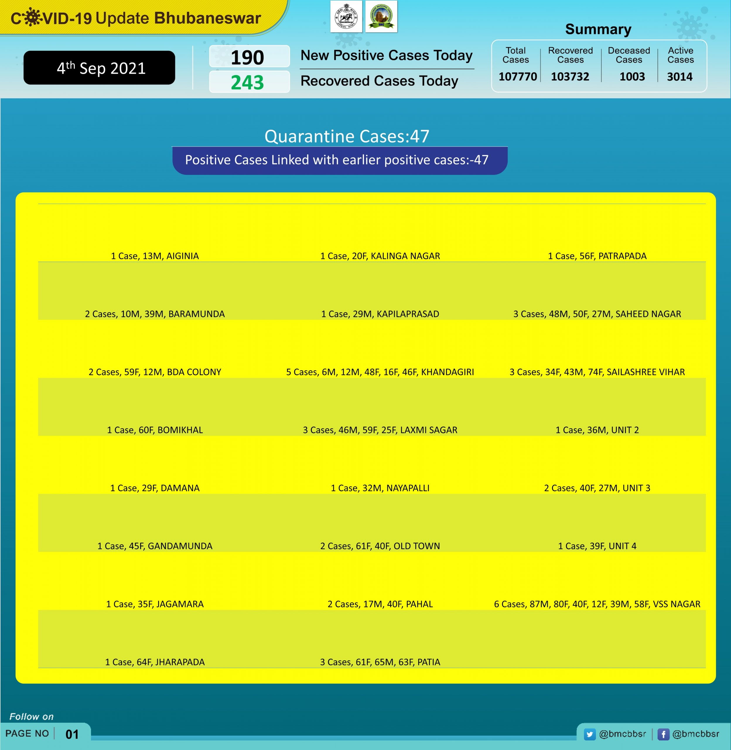 Bhubaneswar: The daily COVID positive cases went below 200 after two days as 190 persons tested positive for the disease in the last 24 hours. The city had reported 243 new cases on Friday and 234 on Thursday.