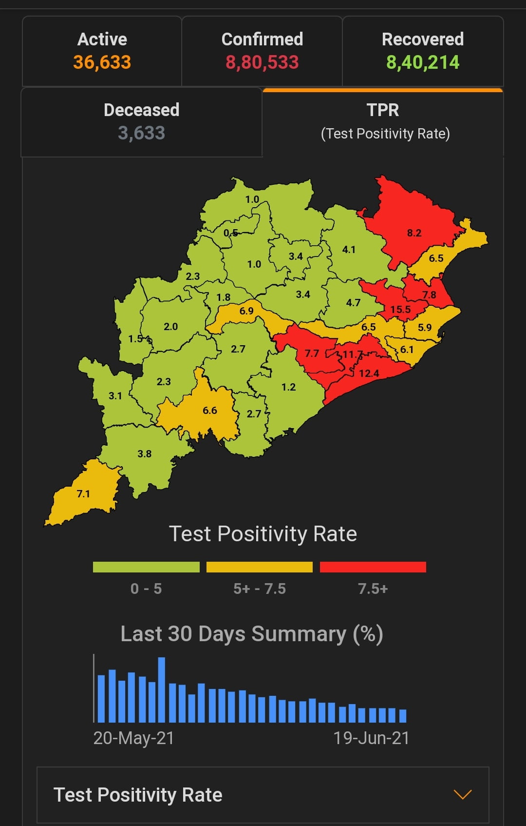 With this, Odisha now has 36,633 active cases with four districts in the Red Zone. At present, 17 districts have a TPR of less than 5 per cent.
