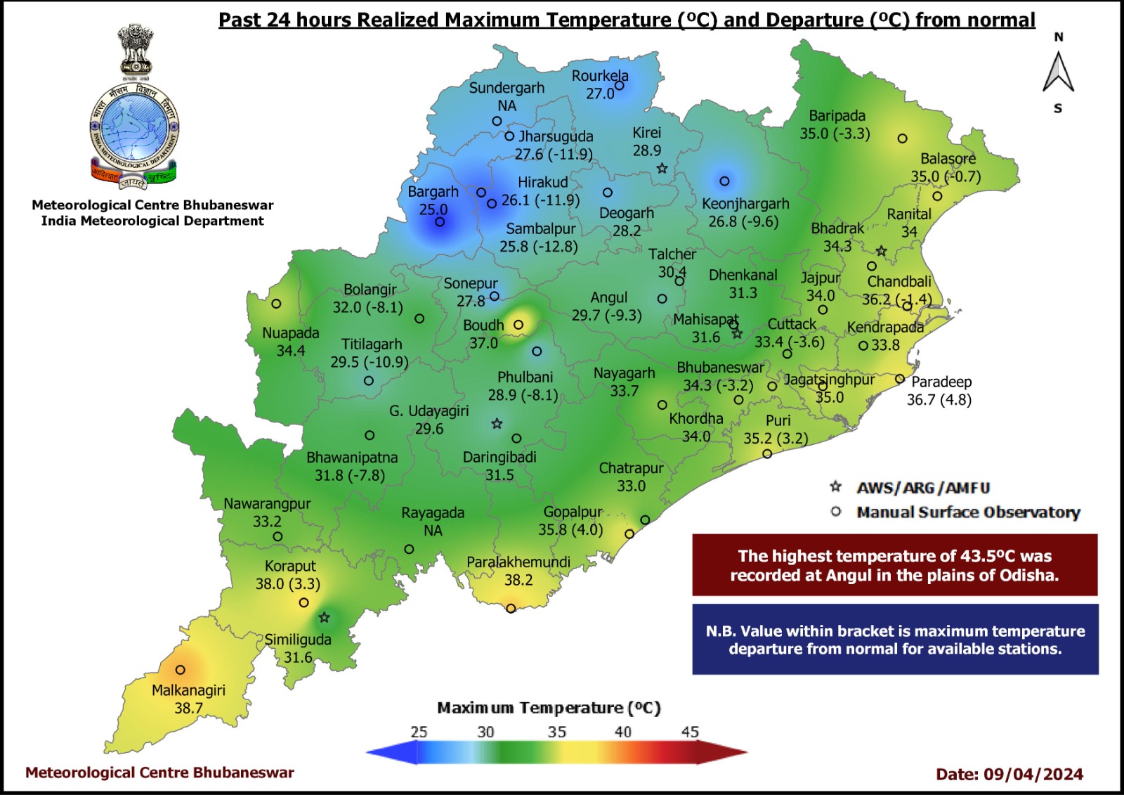 On Monday (April 8), the day temperature plummeted to 34.3°C in Bhubaneswar. It was a drop of almost 10 degrees since April 5 when it was the 6th hottest place in Asia at 43.5°C. Cuttack recorded 33.4 degree Celsius in the last 24 hours. Bargarh (25), Sambalpur (25.8), Hirakud (26.1), Koenjhar (26.8), Rourkela (27), and Sonepur (27.8) also saw significant drop in the maximum temperature. The temperature was 12.8 degrees below normal in Sambalpur.