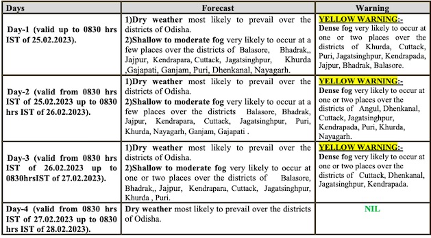The MeT office has issued yellow warning for dense fog at some places in 11 districts of the state till 8.30 am on February 26. Thick blanket of fog had engulfed Cuttack, Bhubaneswar, Kendrapada and Dhenkanal, reducing visibility to 50 metres in the last 24 hours.
