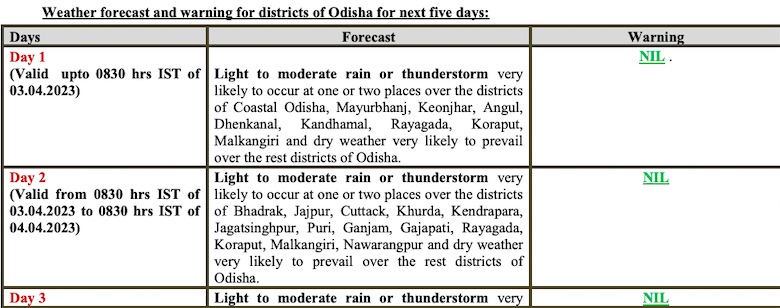 Meanwhile, the MeT office has issued yellow warning for thunderstorm accompanied by lightning and light to moderate rain at some places in Koraput, Cuttack, Khurda, Kandhamal, Nabarangpur, Kalahandi, Rayagada, Nuapada, Balangir, Jharsuguda, Sundargarh, Sambalpur, Angul, Deogarh, Dhenkanal, Mayurbhanj, Balasore, and Keonjhar till 5 in the afternoon.