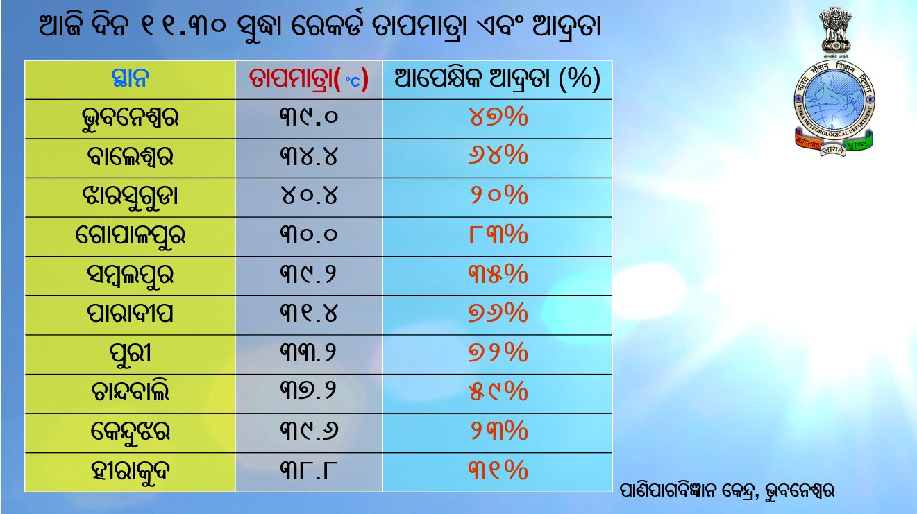 Meanwhile, Jharsuguda had recorded 40.4 degree Celcius till 11.30 am on Friday followed by Keonjhar at 39.6 and Sambalpur at 39.2 degree Celsius. The daytime temperature shot to 39 degree Celsius in Bhubaneswar.