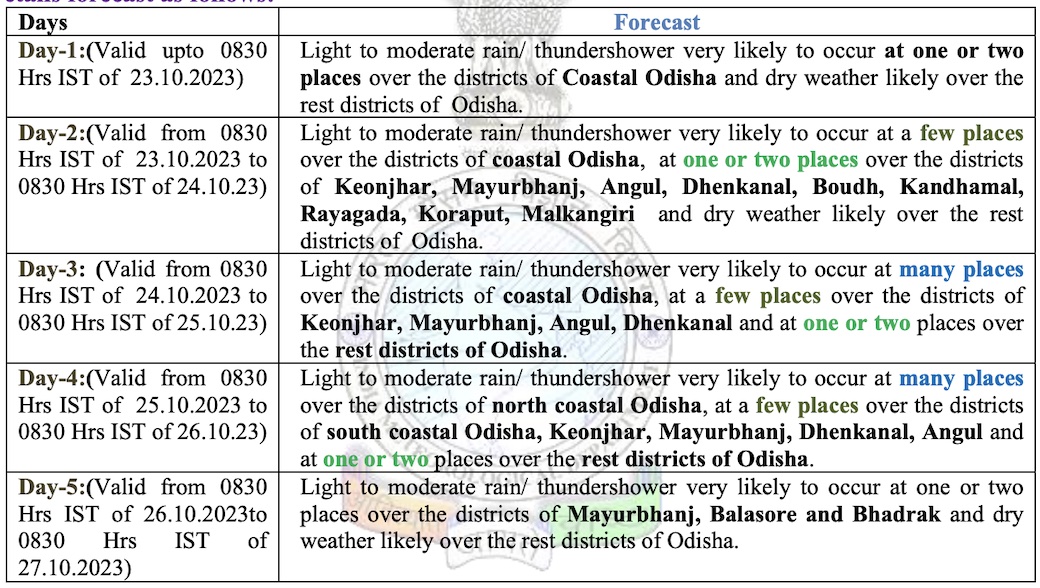 Coast districts of Odisha are also likely to experience light to moderate rainfall at a few places on October 23 and at many places on October 24-25.