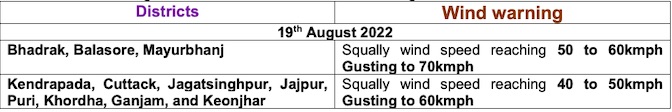 Sea condition is also likely to be rough to very rough over the North Bay of Bengal and along and off Odisha coasts on August 19 and gradually improve becoming rough over the same region from August 20. Local cautionary signal No.3 (LC-3) has been hoisted at all ports of Odisha.