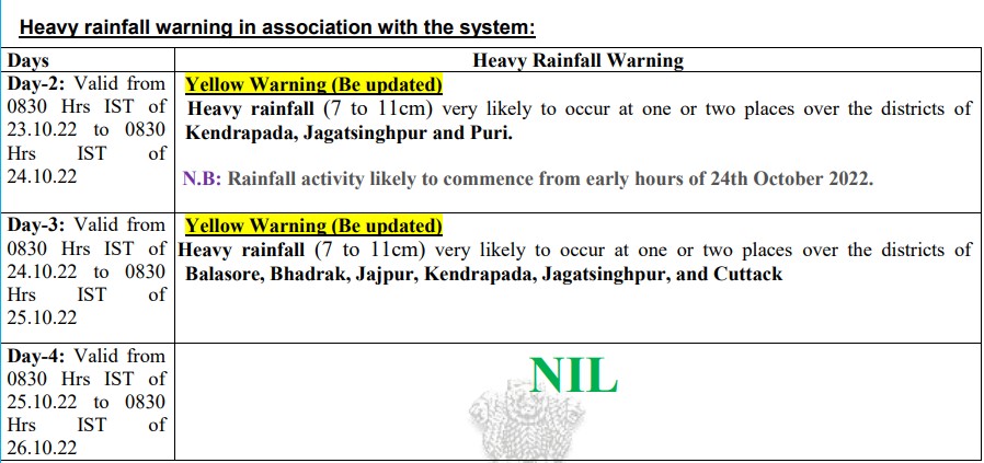 The weather department has issued a yellow warning for heavy rainfall on Sunday and Monday. Heavy rain is likely to occur at one or two places over the districts of Kendrapada, Jagatsinghpur, and Puri from 8.30 am October 23 till 8.30 am October 24.