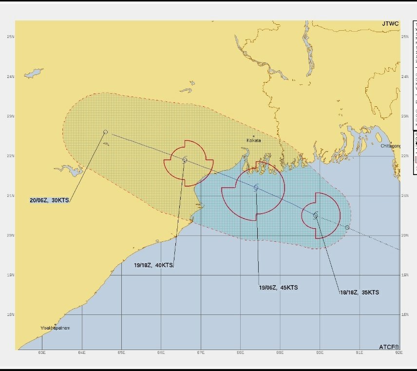 “Numerical model guidance indicates that the system will track west-northwestward towards Kolkata and make landfall within the next 36-48 hours. It is expected to peak in intensity within the next 24-36 hours just before making landfall. The system is expected to track into an area of lower vertical wind shear allowing the system to further intensify. Maximum sustained surface winds are estimated at 28 to 33 knots. The potential for the development of a significant tropical cyclone within the next 24 hours is high,” the JTWC said.
