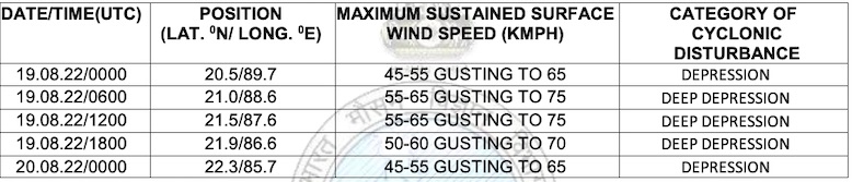 \r\n\r\nThe system is likely to move west-northwestwards and intensify into a deep depression during the next six hours and cross West Bengal and Odisha coasts between Balasore and Sagar Islands by Friday evening. \"After landfall, it would continue to move west-northwestwards across north Odisha, West Bengal and Jharkhand towards north Chhattisgarh and weaken gradually,” it said.\r\n\r\nSqually winds reaching 45-55 kmph gusting to 65 kmph is also likely over north Bay of Bengal and along and off West Bengal, Odisha and Bangladesh coasts during next six hours. It is likely to increase becoming 55-65 kmph gusting to 75 kmph from noon till midnight over the same region. It would improve gradually becoming squally wind speed reaching 40-50 kmph gusting to 65 kmph over northwest Bay of Bengal along and off West Bengal and Odisha coasts from August 20 morning for subsequent 24 hours, the IMD added.\r\n\r\n\"\"\r\n\r\nThe US’ Joint Typhoon Warning Center (JTWC) has warned that the system has the potential to intensify into a cyclone.\r\n“Numerical model guidance indicates that the system will track west-northwestward towards Kolkata and make landfall within the next 36-48 hours. It is expected to peak in intensity within the next 24-36 hours just before making landfall. The system is expected to track into an area of lower vertical wind shear allowing the system to further intensify. Maximum sustained surface winds are estimated at 28 to 33 knots. The potential for the development of a significant tropical cyclone within the next 24 hours is high,” the JTWC said.\r\n\r\n[caption id=\"attachment_355783\" align=\"alignnone\" width=\"856\"]\"\" JTWC Track of Deep Depression In Bay Of Bengal[/caption]\r\n\r\n \r\n\r\nUnder the influence of the system, heavy to very heavy rain is likely to lash several districts of Odisha. The IMD has also issued a red warning for four districts.\r\n\r\nCheck the forecast for August 19-20\r\n\r\nAug 20 (till 8.30 am)\r\nRed warning: Heavy to very heavy rainfall (7 to 20 cm) at a few places with isolated extremely heavy falls (>20cm) is very likely to occur over Keonjhar, Bhadrak, Balasore and Mayurbhanj districts.\r\n\r\nOrange warning: Heavy to very heavy rainfall (7 to 20 cm) is very likely to occur at a few places over Kendrapada, Jagatsinghpur, Cuttack, Dhenkanal, Angul, Deogarh, Sundargarh, Sambalpur, Sonepur, Boudh, Bolangir and Jajpur districts.\r\n\r\nYellow warning: Heavy rainfall (7 to 11 cm) is very likely to occur at isolated places over Jharsuguda, Bargarh, Kalahandi, Kandhamal, Ganjam, Nayagarh, Khurda and Puri districts.\r\n\r\nAug 20 (8.30 am) to Aug 21 (8.30 am)\r\nOrange warning: Heavy to very heavy rainfall (7 to 20 cm) is very likely to occur at one or two places over Jharsuguda, Sundargarh, Keonjhar, Deogarh, Sambalpur, Bargarh, Sonepur and Balangir districts.\r\n\r\nYellow warning: Heavy rainfall (7 to 11 cm) is very likely to occur at isolated places over Mayurbhanj, Angul, Boudh, Kalahandi, Nuapada, Nabarangpur and Dhenkanal districts.\r\n\r\n ","author":{"@type":"Person","name":"OB Bureau","url":"https://odishabytes.com/author/bureauob/","sameAs":["https://www.odishabytes.com","BytesOdisha"]},"articleSection":["Featured","Odisha"],"image":{"@type":"ImageObject","url":"https://assets.odishabytes.com/wp-content/uploads/2022/08/imd.jpeg","width":975,"height":615},"publisher":{"@type":"NewsMediaOrganization","name":"OdishaBytes","url":"https://odishabytes.com","logo":{"@type":"ImageObject","url":"https://odishabytes.com/wp-content/uploads/2024/11/Odisha-Byyes-Logo150-min.png"},"sameAs":["https://www.facebook.com/odishabytes/","https://x.com/BytesOdisha","https://www.youtube.com/channel/UCZzaxCAclS9UoMtl51XuXkQ","https://odishabytes.com/feed/","https://news.google.com/publications/CAAqKggKIiRDQklTRlFnTWFoRUtEMjlrYVhOb1lXSjVkR1Z6TG1OdmJTZ0FQAQ?hl=en-IN&gl=IN&ceid=IN%3Aen"]},"isAccessibleForFree":true}