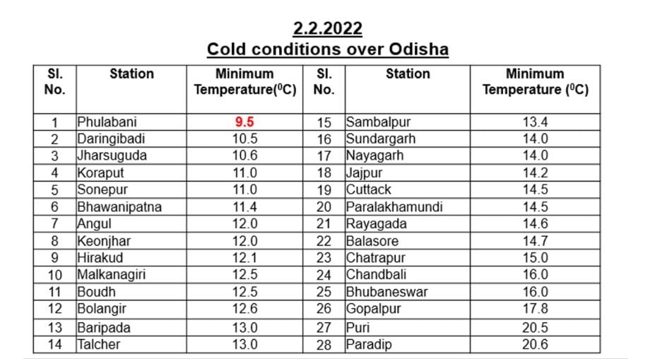 Meanwhile, Similuguda was the coldest place in the state at 8.7 degree Celsius this morning, followed by Kirei at 9 degree Celsius, G Udayagiri at 9.4 degree Celsius, Phulbani at 9.5 degree Celsius, Daringbai at 10.5 degree Celsius and Jharsuguda at 10.6 degree Celsius.