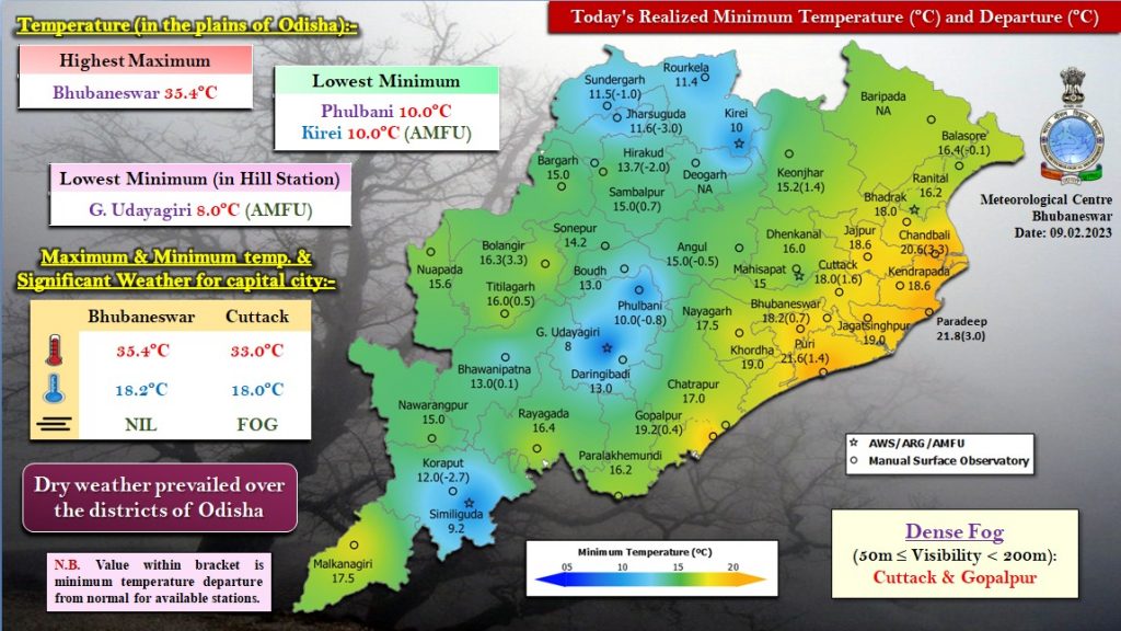 A thick blanket of fog is likely to engulf one or two places in Ganjam, Kandhamal, Nayagarh, Khurda, Cuttack and Jagatsinghpur in the subsequent 24 hours. Ganjam, Gajapati, Koraput, Kandhamal, Nayagarh, Khurda, Cuttack, Angul, Dhenkanal, Jajpur, Kendrapada, Jagatsinghpur and Puri are likely to experience shallow to moderate fog.