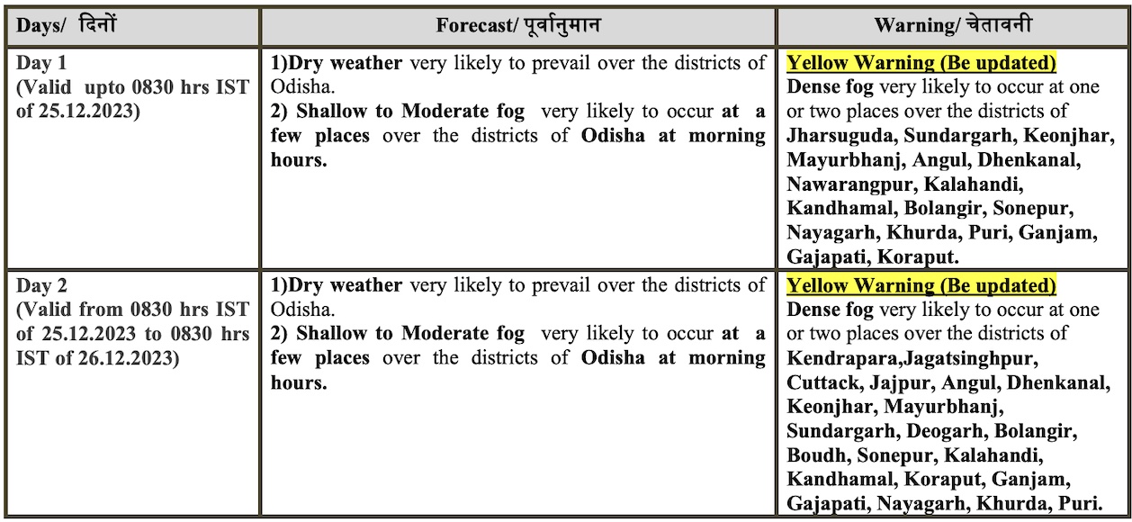 Amid the prevailing dry weather, some places also experience dense fog this morning, which restricted visibility to 40 metres in Rourkela, 50 metres in Koraput, 60 metres in Nayagarh, 70 metres in Phulbani, 90 metres in Balangir, and 100 metres in Titlagarh. Bhawanipatna, Sundagarh, Keonjhar and Sonepur experience shallow to moderate fog.