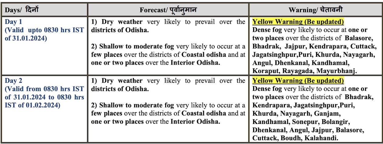 Bhubaneswar: While cold wave conditions have ebbed, dense fog will continue during the night and early hours at several places in Odisha for another two days followed by rain from February 1, the India Meteorological Department (IMD) informed on Tuesday.