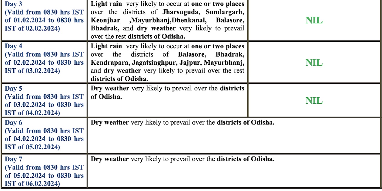 Bhubaneswar: While cold wave conditions have ebbed, dense fog will continue during the night and early hours at several places in Odisha for another two days followed by rain from February 1, the India Meteorological Department (IMD) informed on Tuesday.
