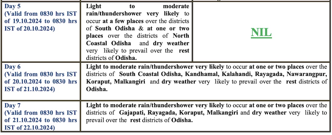 The weather agency has sounded yellow warning of thunderstorm with lightning for isolated places in Gajapati, Ganjam, Rayagada, Koraput, Malkangiri, Mayurbhanj and Keonjhar districts on October 17, and Balasore, Bhadrak, Jajpur, Kendrapada, Cuttack, Jagatsinghpur, Puri, Khurda, Nayagarh, Ganjam, Gajapati, Kandhamal, Kalahandi, Rayagada, Nabarangpur, Koraput and Malkangiri on October 18.