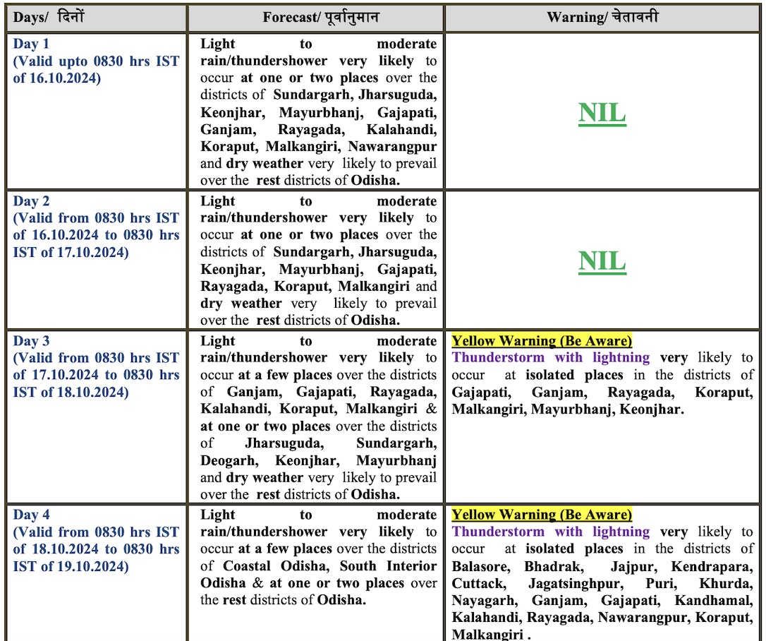 The weather agency has sounded yellow warning of thunderstorm with lightning for isolated places in Gajapati, Ganjam, Rayagada, Koraput, Malkangiri, Mayurbhanj and Keonjhar districts on October 17, and Balasore, Bhadrak, Jajpur, Kendrapada, Cuttack, Jagatsinghpur, Puri, Khurda, Nayagarh, Ganjam, Gajapati, Kandhamal, Kalahandi, Rayagada, Nabarangpur, Koraput and Malkangiri on October 18.