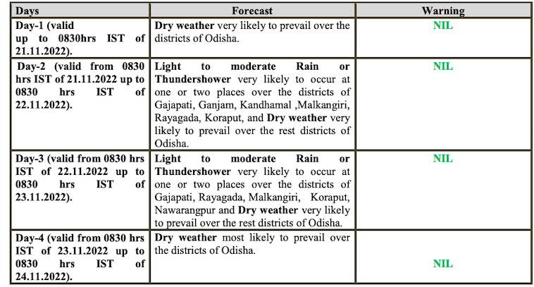 According to the midday bulletin, dry weather will prevail in Odisha with light to moderate rain at some places in the next two days. Thundershowers are likely in Gajapati, Ganjam, Kandhamal, Malkangiri, Rayagada, and Koraput on November 21 and Gajapati, Rayagada, Malkangiri, Koraput and Nabarangpur on November 22.