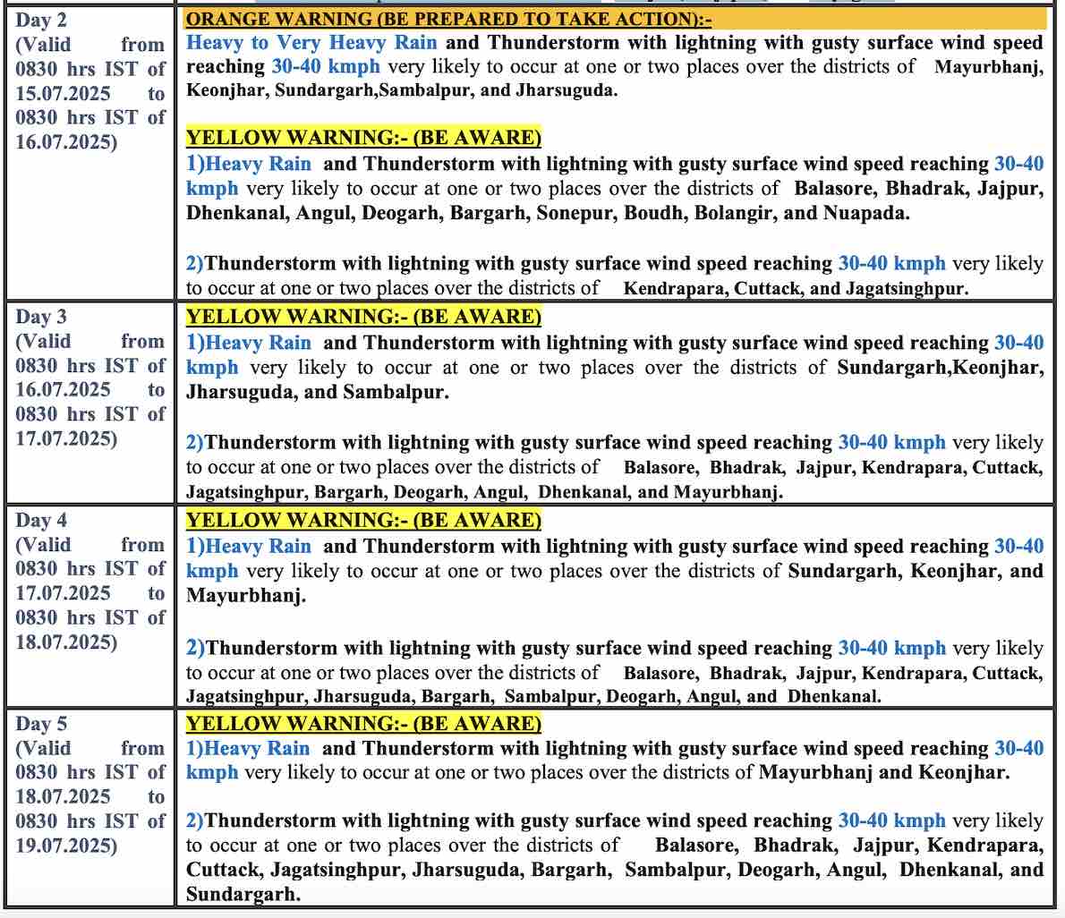There is also a warning of heavy rain along with thunderstorm/lightning and gusty surface wind speed reaching 30-40 kmph for one or two places in Sambalpur, Jharsuguda, Sonepur, Boudh, Nayagarh, Cuttack, Khurda, Puri, Jagatsinghpur, Kalahandi, Kandhamal, and Koraput. 2)Thunderstorm with lightning with gusty surface wind speed reaching 30-40 kmph may also occur at one or two places in Ganjam, Gajapati, and Rayagada districts.