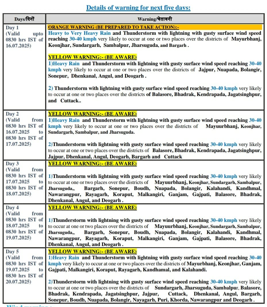 The IMD has issued an orange warning of heavy to very heavy rain and thunderstorm with lightning with gusty surface wind speed reaching 30-40 kmph at some places of Mayurbhanj, Keonjhar, Sundargarh, Sambalpur, Jharsuguda, and Bargarh districts by Wednesday morning.