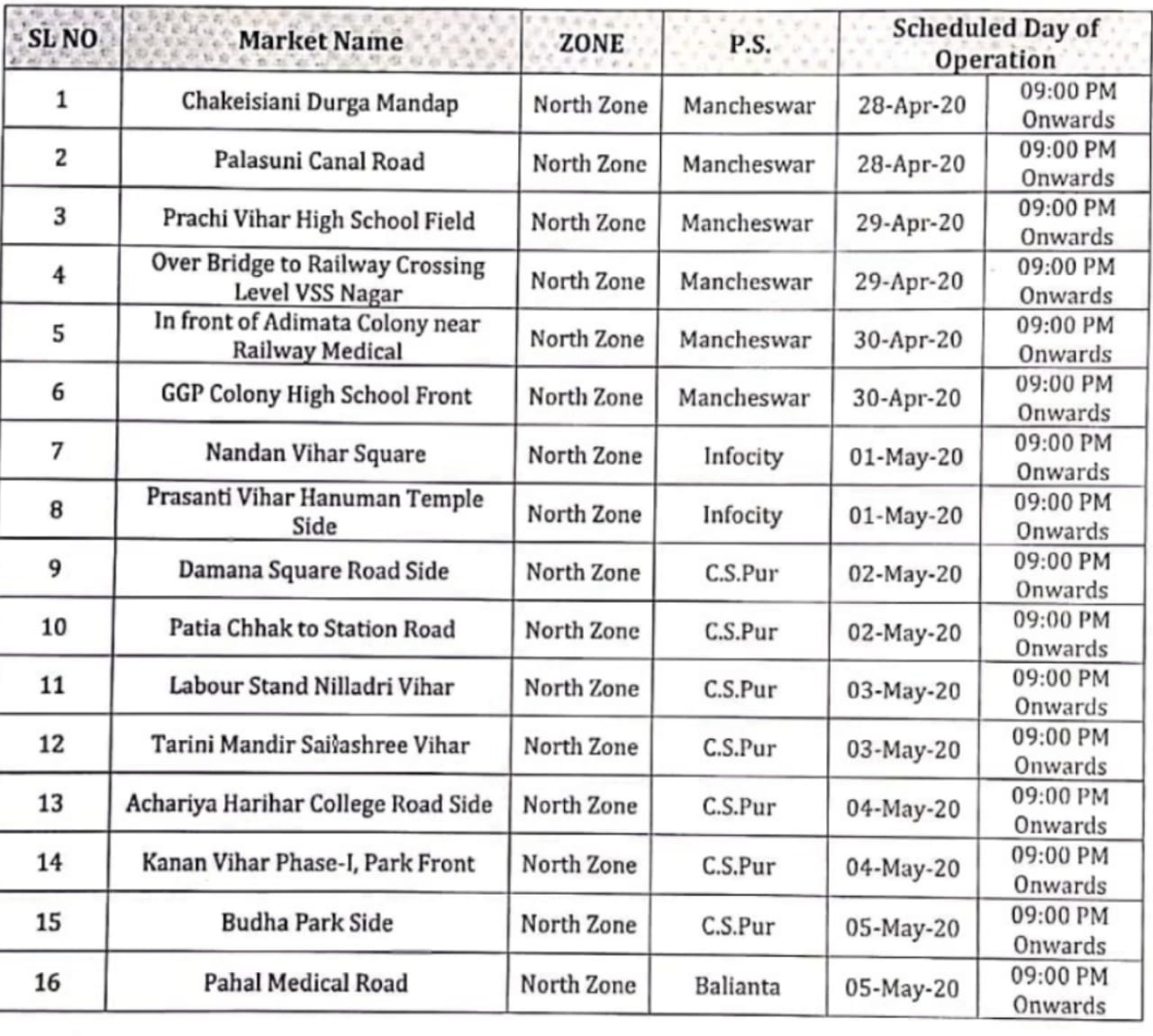 In a trial sanitation drive, the civic body had used drones for spraying disinfectants along the stretch from Raj Mahal Square to Sishu Bhavan Square on April 14. Later from April 15 to 22, the drones were engaged to spray disinfectant in 17 major market places/haats across the city. They were Unit I Daily Market, Unit II Market Building, Indradhanu Daily Market, Ruchika Daily Market, Saheed Nagar Daily Market, Maa Kochilei Daily Market, Unit III Daily Market, Unit IV Daily Market, Nageswar Tangi Daily Market, Old Town Daily Market, BJB Nagar Daily Market, Bapuji Nagar Kiosks, Damana Haat, VSS Nagar Daily Market, Gandamunda Daily Market, Siripur Daily Market and Kapilaprasad Weekly Market.