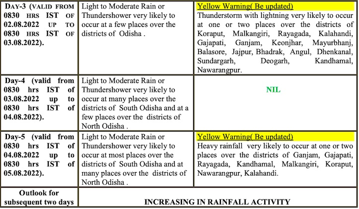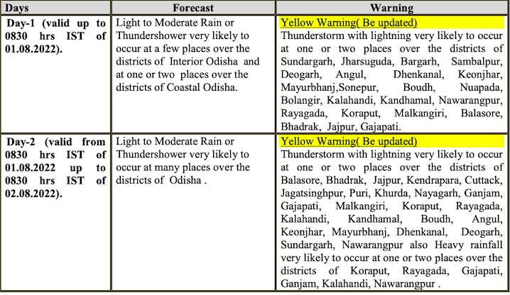 Light to moderate rain will commence from August 3, while very heavy rainfall is likely to occur in the coastal and southern districts between August 7 and 9 under the impact of the system. Interior and north Odisha districts will experience similar weather conditions thereafter.