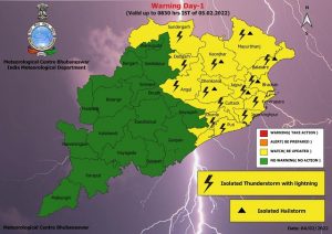 Yellow warning: Thunderstorm with lightening very likely to occur at one or two places over the districts of Balasore, Bhadrak, Jajpur, Kendrapada, Cuttack, Jagatsinghpur, Sundargarh, Deogarh, Angul, Dhenkanal, Keonjhar, Mayurbhanj, Khurda and Puri; and hailstorm very likely to occur at one or two places over the districts of Dhenkanal, Jajpur, Keonjhar, Mayurbhanj, Bhadrak and Balasore.