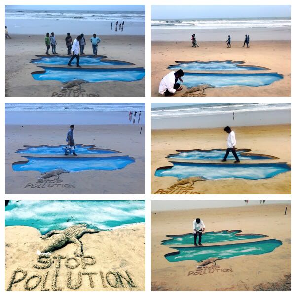 Puri: Globally acclaimed artist Sudarsan Pattnaik created a 3D sand art with the message ‘Stop Pollution’, keeping with the theme of this year’s Earth Day, on Puri sea beach on Friday.