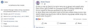 Bhubaneswar: Ace sprinter and Election Commission’s brand ambassador Dutee Chand has landed in trouble after she appeared to support BJD leader Achyuta Samanta, who is contesting the Lok Sabha polls from Kandhamal, on her Facebook page.