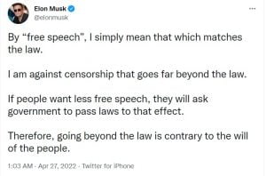 In order to contain the market sentiment, Musk tweeted, “By free speech, I simply mean that which matches the law. I am against censorship that goes beyond the law.”