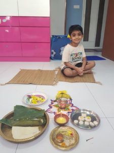 “I put Rangoli at home. My husband, me and my son bow our heads before Sathi Devi. We make our son sit in front of the deity and do bandapana. We then put raw rice, duba (a type of grass) and barakoli (Jujube) leaves on the head of the child seven times to remove all evil. We serve seven pithas to the podhuan,” said Subhra Sarita Das, mother of Swostik Smarak Rout. Subhra with her husband Subhankar Rout have also been staying in Singapore.