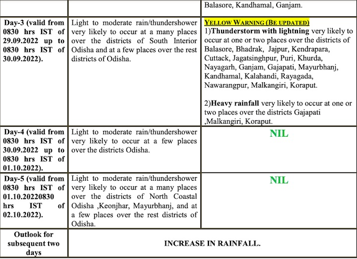 Yellow warning for heavy rainfall has been issued for one or two places in Gajapati, Malkangiri and Koraput on September 29. Thunderstorm with lightning alert has also been sounded for one or two places in Balasore, Bhadrak, Jajpur, Kendrapada, Cuttack, Jagatsinghpur, Puri, Khurda, Nayagarh, Ganjam, Gajapati, Mayurbhanj, Kandhamal, Kalahandi, Rayagada, Nabarangpur, Malkangiri and Koraput districts.